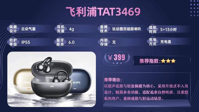 飞利浦TAT3469以原声还原与轻盈佩戴为核心,采用开放式不入耳设计,精简多余功能,适配追求自然听感、注重隐私的用户,兼顾通勤与轻运动场景。