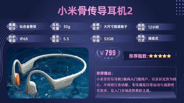 小米骨传导耳机2面向入门级运动用户,以亲民定价、均衡配置为核心,不堆砌花哨功能,专注核心体验打磨,是入门市场高性价比的优选机型。