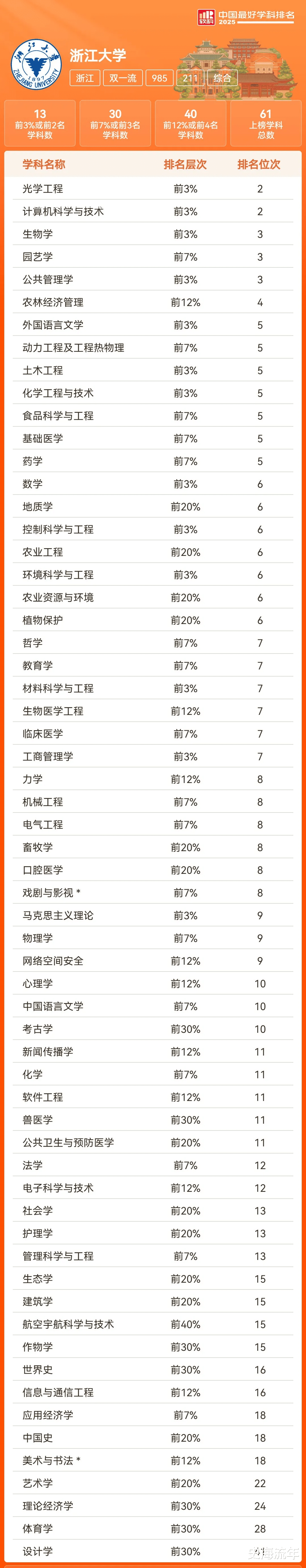 有些遗憾的是,浙江大学没有在全球高校中排名第一的学科,也没有在全国高校中排名第一的学科,排名前两名的学科则多达13个。这意味着浙江大学在学科上实现顶尖突破,已经近在咫尺了。
