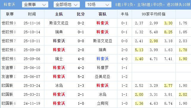 科索沃:球队已锁定附加赛资格,此役更多是主场荣誉之战。首回合他们惨败于瑞士,此番主场作战,球员们有着强烈的复仇欲望,同时也希望用一场出色表现提升士气,为后续附加赛蓄力,整体战意拉满。而且其主场表现强悍,近 5 个主场 4 胜 1 平,主场胜率高达 80%,狂热的主场氛围也会给球队带来不少加持。