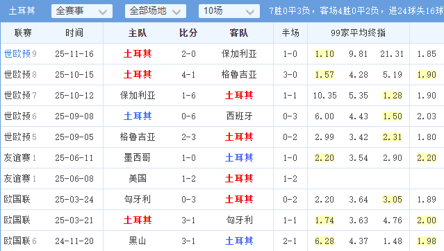 西班牙:目前球队以 16 分领跑小组,领先土耳其 3 分且有着 14 球的巨大净胜球优势,此役主场作战只需保持不败,就能锁定小组第一拿到世界杯直接晋级名额。此外球队近 5 次与土耳其对决 3 胜 2 平保持不败,心理层面占据绝对优势。不过球队核心诉求是稳健拿分,加上部分主力刚结束密集联赛,可能存在专注度下滑的情况,战意虽足但不会过于冒进。而且其主场表现强悍,近 10 场主场 8 胜 2 平,狂热的主场氛围能给球队不少加持。