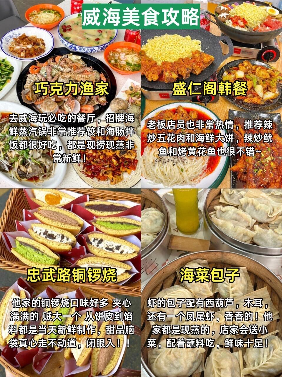 ✅巧克力渔家的海鲜蒸汽锅和海肠拌饭挺鲜,海鲜现捞🦞很不错😋;✅海菜包子和✅忠武路铜锣烧都是威海比较有特色的美食,可以尝一尝味道很棒👍🏻;✅盛仁阁韩餐家的辣炒五花肉和海鲜大饼很不错🥟。