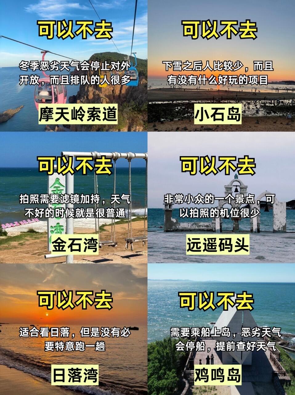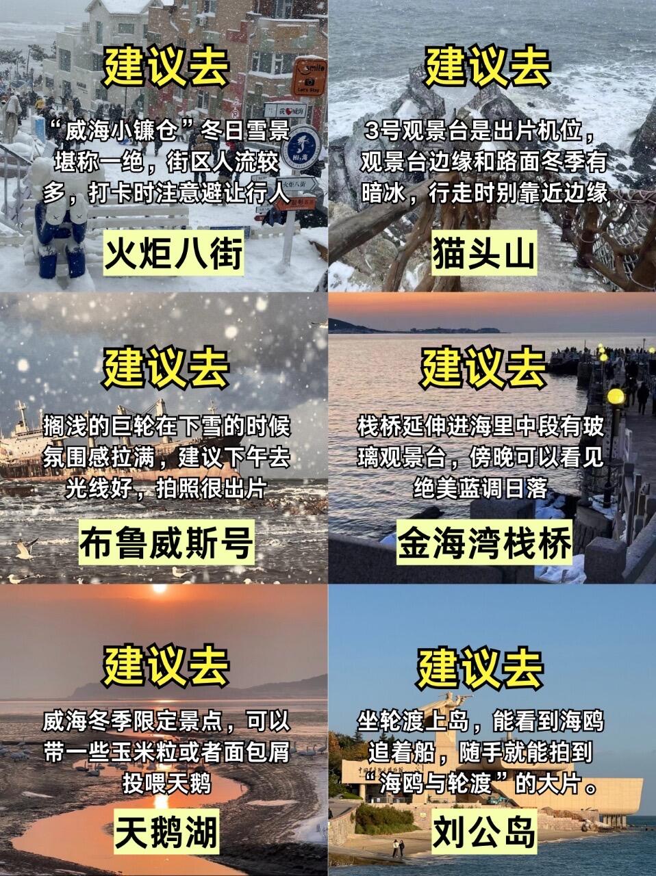 火炬八街雪景很出片📸,布鲁威斯沉船氛围感不错,金海湾栈桥海浪好看🌊,烟墩角可以看天鹅🦢。冬天小石岛、摩天岭索道和金石湾个人觉得不用特意去,体验一般。