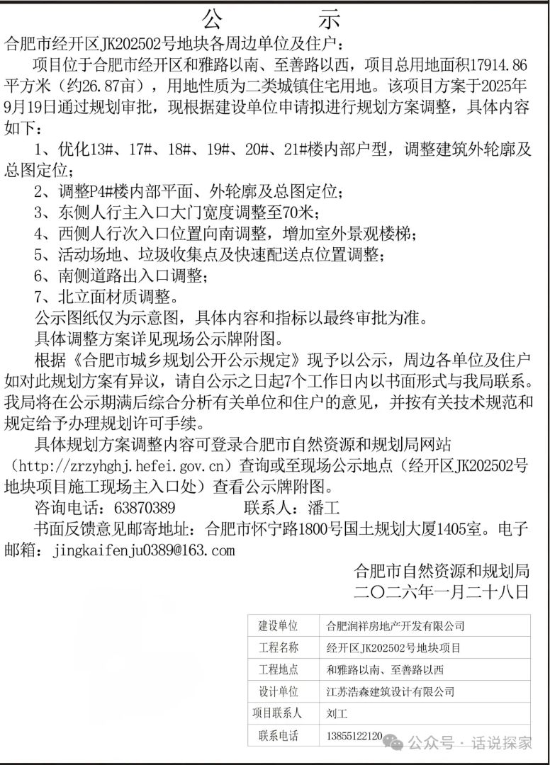 经开区华润嘉宸规划方案调整公示,项目位于合肥市经开区和雅路以南、至善路以西,项目总用地面积17914.86平方米(约26.87亩),用地性质为二类城镇住宅用地,具体内容如下:
