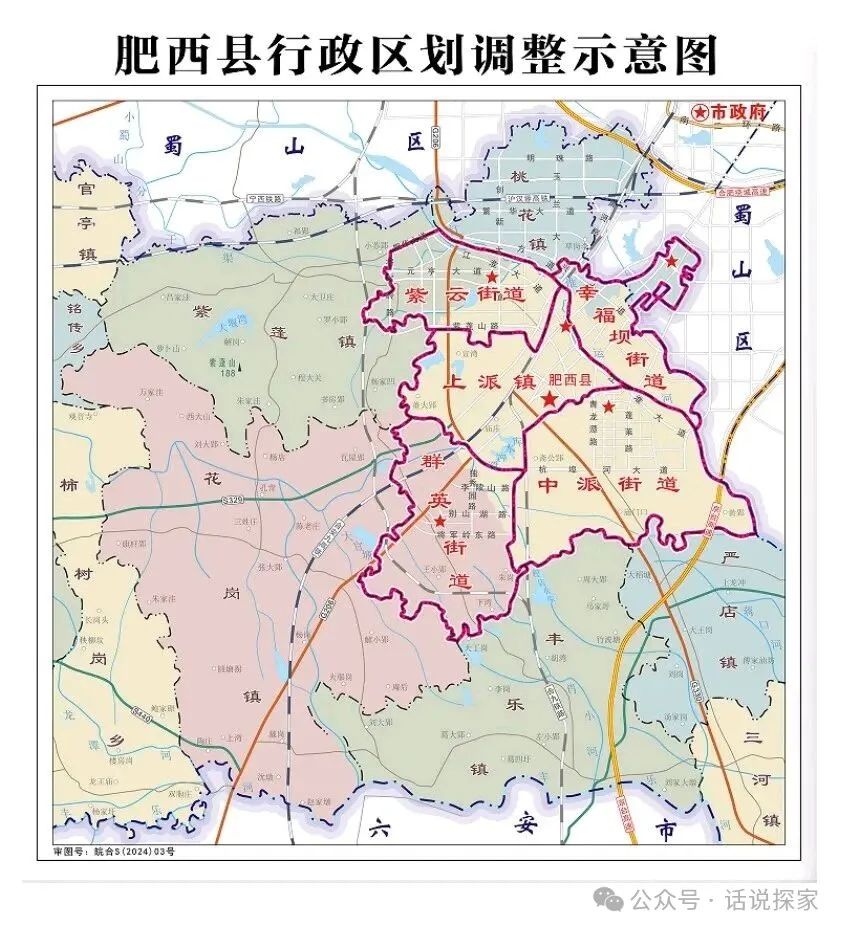 经省委、省政府批准,以调整肥西县上派镇管辖范围为主,小幅变更肥西县桃花镇、紫蓬镇、花岗镇部分行政区域界线,设立肥西县幸福坝街道、中派街道、紫云街道、群英街道。
