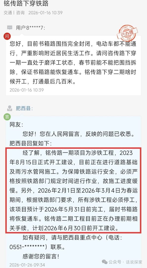 网友留言反映合肥的铭传路下穿进展,官方最新回应来了。