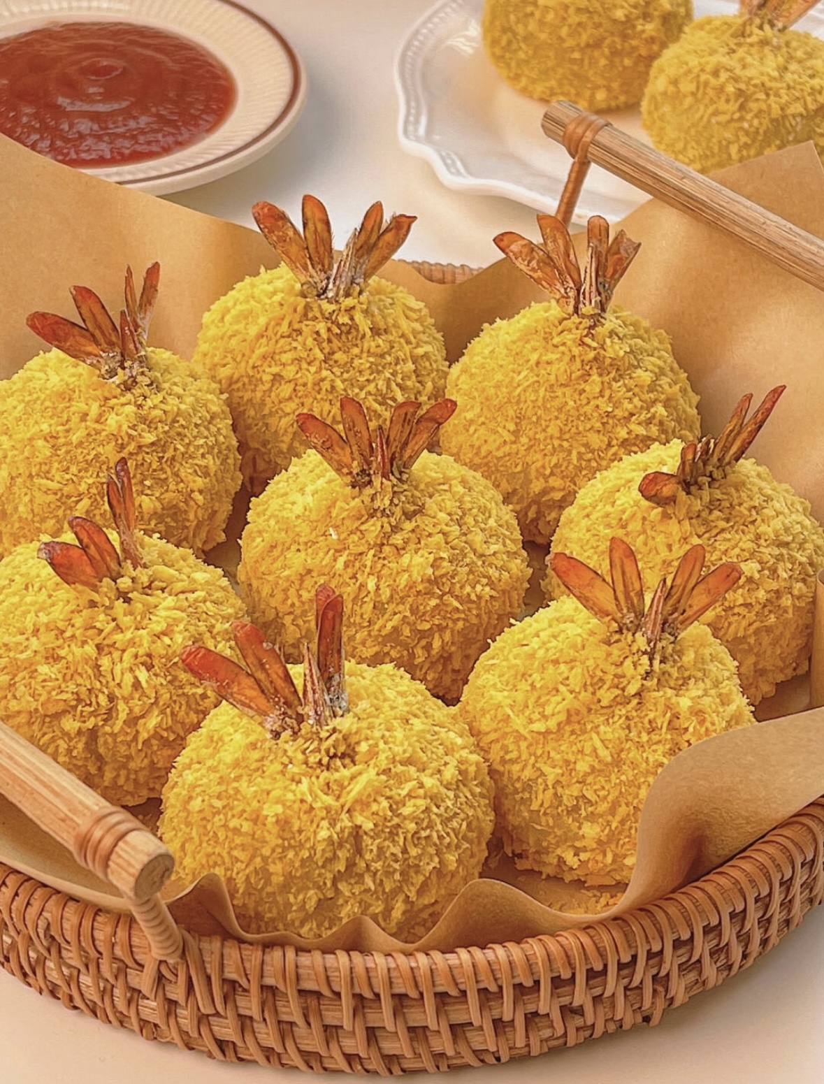 接下来进入“搓球球”环节,也是全场最治愈的时刻。双手抹点凉水防粘,揪一团土豆泥先捏成小碗状,把虾仁像藏宝藏一样塞进去,再慢慢收口,最后两手来回倒腾几圈,圆得能当乒乓球。这里有个小秘密:土豆泥别包太厚,一厘米足够,炸的时候才能“外酥内爆汁”;虾仁尾巴可以故意留一点在外,炸完像举着个小红旗,颜值瞬间拉满。全部搓好后,按顺序排队:淀粉→蛋液→面包糠,一个都不能少。淀粉是“打底衫”,吸干表面水分;蛋液是“胶水”,让面包糠牢牢挂住;面包糠则是“羽绒服”,下锅一炸立刻蓬松。很多人抱怨炸完掉糠,多半是蛋液太薄或面包糠压得不实,记住“蘸、按、抖”三字诀:蘸满蛋液后把虾球扔进面包糠里,用手指轻轻按压,再抖掉多余粉末,保准一件“外套”穿到出锅。