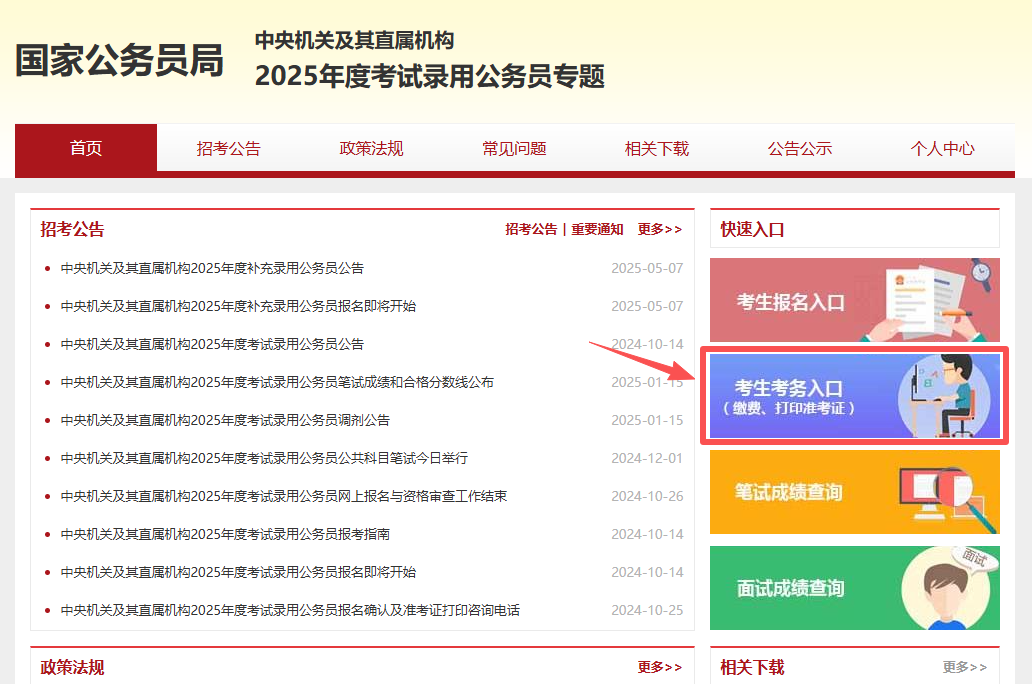 进入“中央机关及其直属机构考试录用公务员专题网站首页-考生考务入口【报名确认及准考证打印系统】。