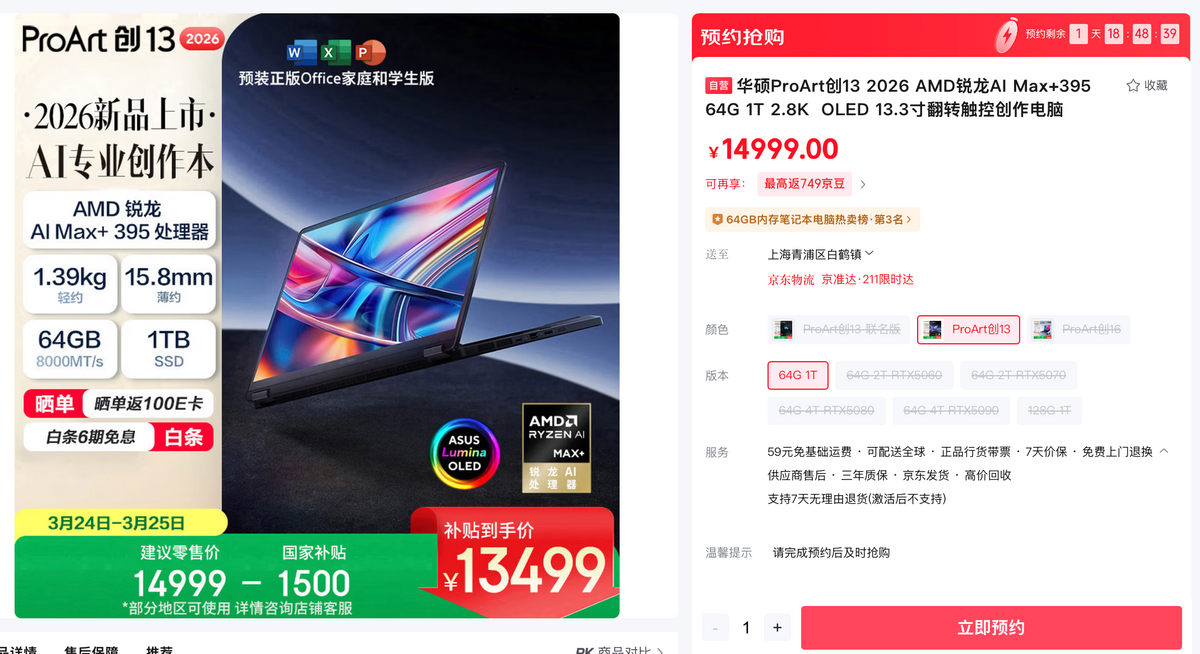 在AMD 锐龙 AI Max+ 395 移动处理器的加持下,华硕ProArt 创13 2026将工作站级强悍算力与极致便携深度融合,以全场景无短板的专业实力,打破户外创作种种限制,让每份奔赴山野的灵感,都能随时随地高效落地。当前购机,可享晒单返100E卡、白条6期免息福利,叠加至高1500元国家补贴,到手13499元。尤其适合成为户外创作者焕新生产力装备的首选。