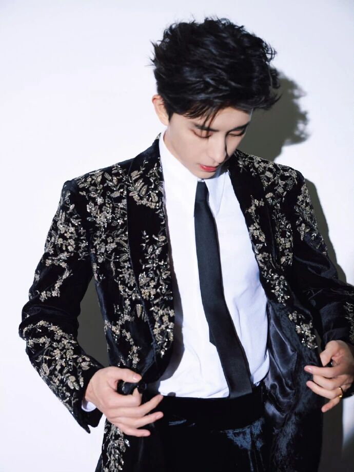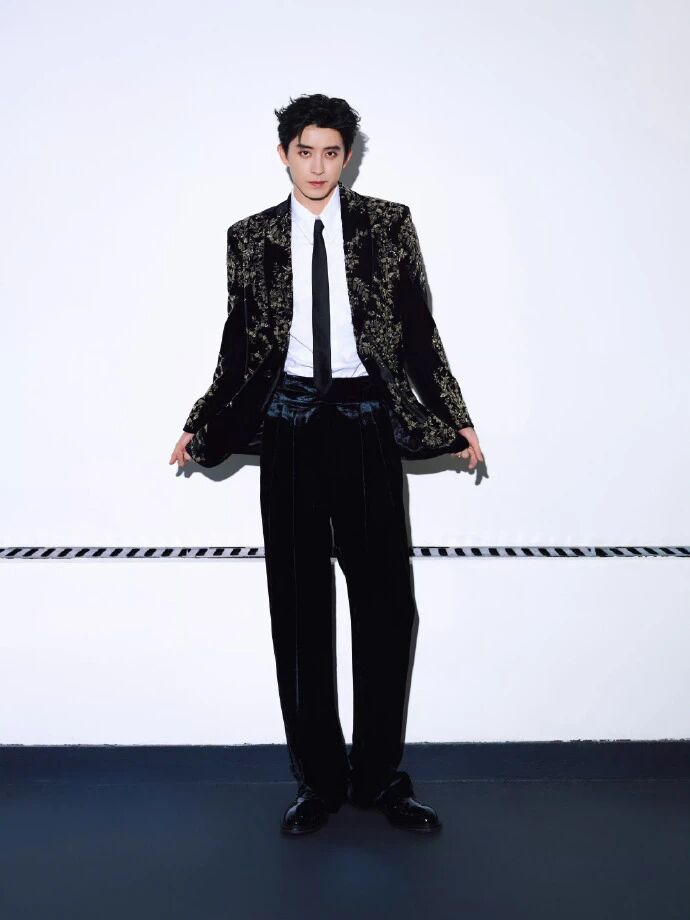 :丝绒的暖、金绣的亮,撞着他的清俊眉眼 —— 艳是 “绣的骨”,雅是 “人的魂”,反差里的绅士感不是 “摆拍的派头”,是 “华丽掉进少年气里的自在”;连领带的细锐,都是 “让丝绒不腻的戏眼”,衬得少年绅士不老气,有骨相的清。动作的 “无演松弛”