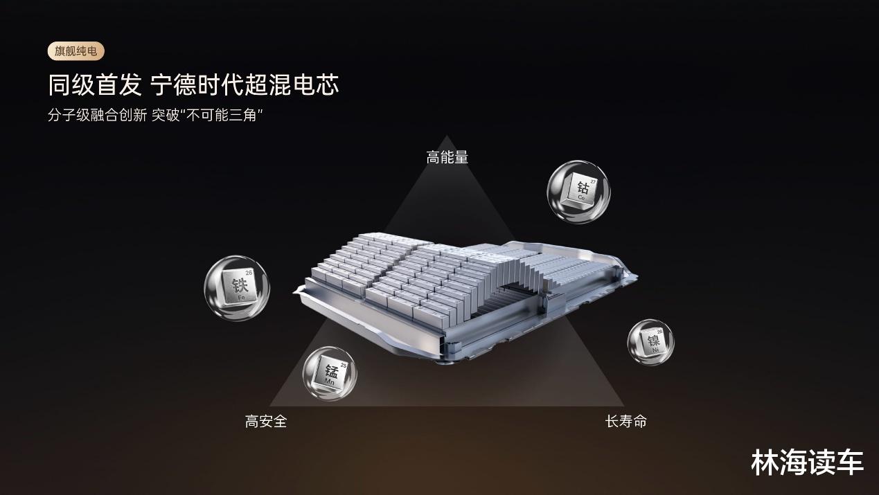 续航和技术上已经不是秘密,推出增程和纯电两种选择。纯电版本车型首发宁德时代三元锂和磷酸铁锂混合的“超混电芯”,除了最低配的磷酸铁锂,全息115度电池包,最高续航里程720公里。全系支持1000V高压架构,充电15分钟补能超350公里。34合1超级集成热管理系统,简化的系统为整车布置空间节省了30%,提供全车热量最优分配。