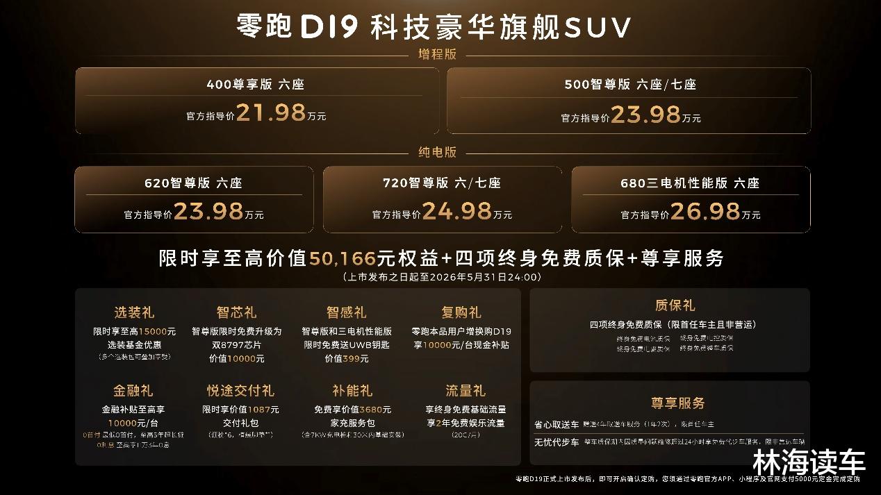 预热了一个季度后,零跑最顶级的SUV带着零跑多年来的造车结晶-D19正式上市,如果看过年初和去年年末我们关于零跑文章的朋友一定有印象,我对于D19和D99的价格预期结合零跑在各种场合对于D系列的各种解读,都透露着这台车不便宜。不过价格的公布21.98-26.98万元。让所有人包括我大吃一惊。结合尺寸和整车硬实力,看起来零跑要掀起腥风血雨。