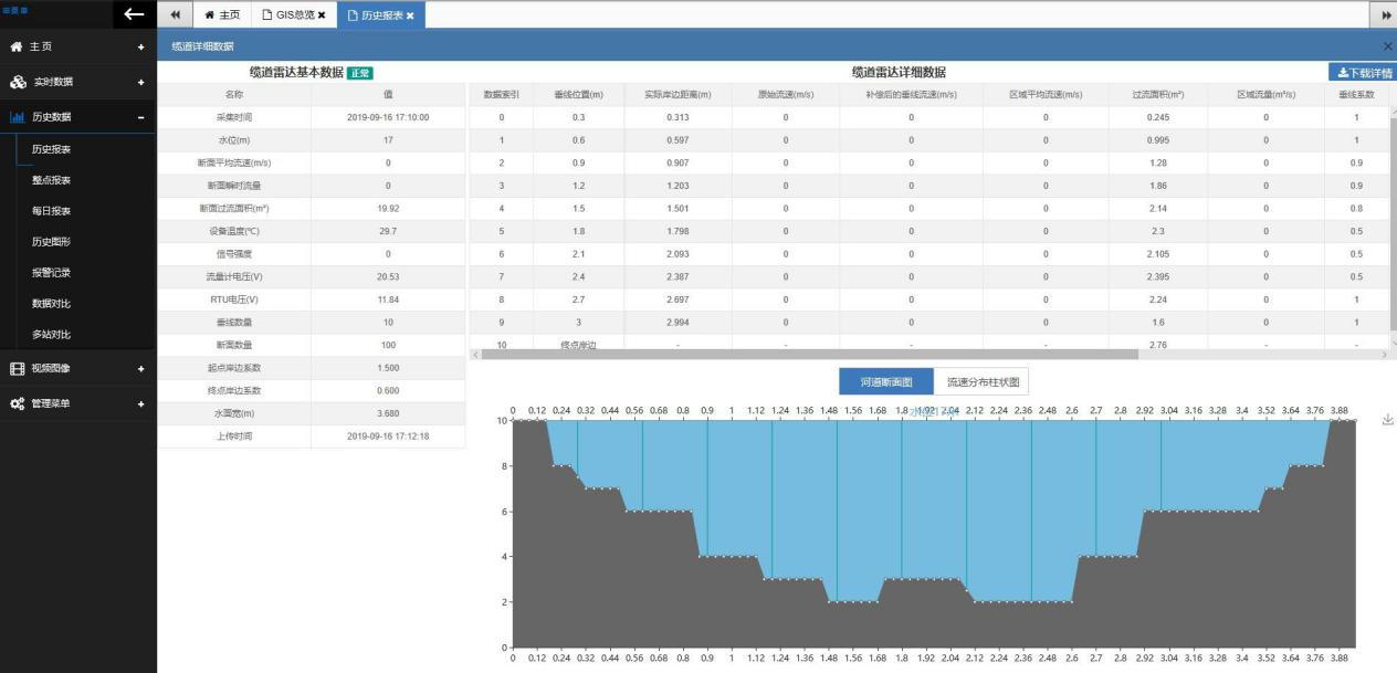云平台集成 GIS 地理信息模块,工作人员通过卫星地图查看测站分布与设备状态,点击单站可获取水位、流速、流量等实时参数。平台支持历史数据查询、曲线绘制与报表导出,按水文规范自动推算日平均水位流量,还可定制水位超幅告警、设备低电提醒等功能,提升数据利用效率与跨区域共享能力。