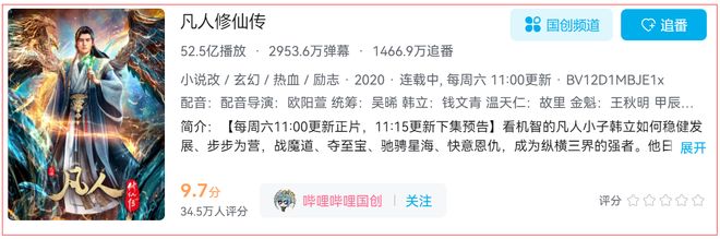 近两年,国漫领域诞生了现象级佳作《凡人修仙传》,其凭借精良制作斩获全网超高口碑。在B站,该剧评分稳定在9.7分,追番人数突破千万,全网播放量更是飙升至50亿次,热度之高曾一度导致B站服务器承压。这部作品不仅巩固了自身国漫巅峰的地位,更将东方仙侠文化成功推向海外,用实打实的数据印证了优质内容的破圈实力。