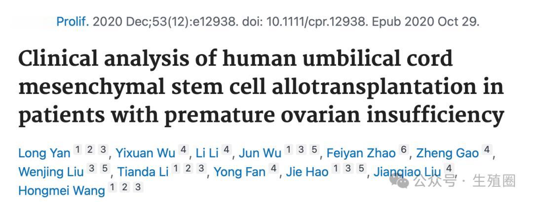 Clinical analysis of human umbilical cord mesenchymal stem cell allotransplantation in patients with premature ovarian insufficiency. Cell Prolif. 2020 Dec;53(12):e12938. doi: 10.1111/cpr.12938. Epub 2020 Oct 29.