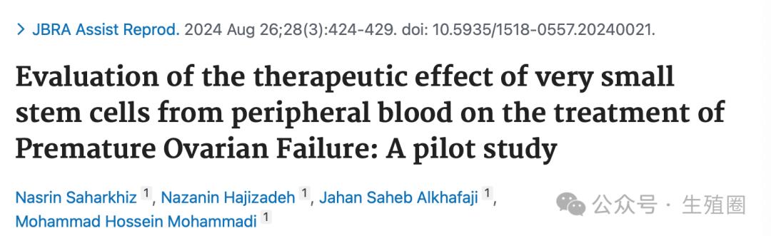 Evaluation of the therapeutic effect of very small stem cells from peripheral blood on the treatment of Premature Ovarian Failure: A pilot study. JBRA Assist Reprod. 2024 Aug 26;28(3):424-429. doi: 10.5935/1518-0557.20240021.