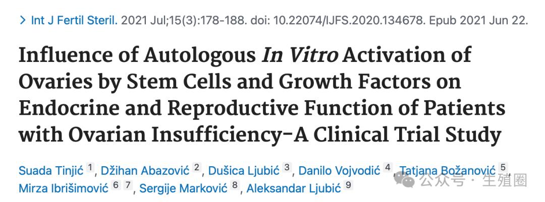 Influence of Autologous In Vitro Activation of Ovaries by Stem Cells and Growth Factors on Endocrine and Reproductive Function of Patients with Ovarian Insufficiency-A Clinical Trial Study. Int J Fertil Steril. 2021 Jul;15(3):178-188. doi: 10.22074/IJFS.2020.134678. Epub 2021 Jun 22.