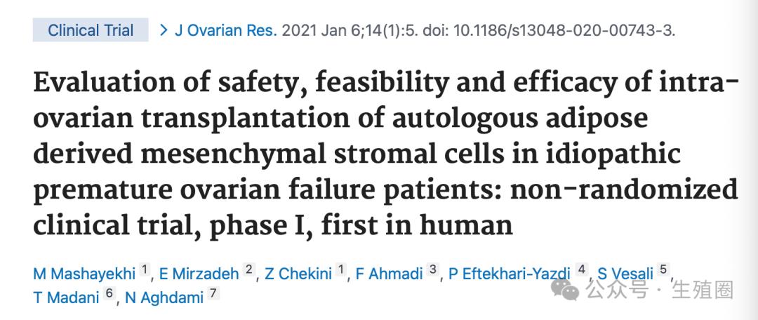 Evaluation of safety, feasibility and efficacy of intra-ovarian transplantation of autologous adipose derived mesenchymal stromal cells in idiopathic premature ovarian failure patients: non-randomized clinical trial, phase I, first in human. J Ovarian Res. 2021 Jan 6;14(1):5. doi: 10.1186/s13048-020-00743-3.