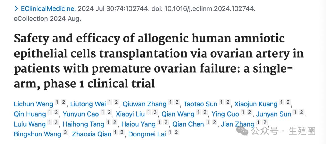 Safety and efficacy of allogenic human amniotic epithelial cells transplantation via ovarian artery in patients with premature ovarian failure: a single-arm, phase 1 clinical trial. EClinicalMedicine. 2024 Jul 30;74:102744. doi: 10.1016/j.eclinm.2024.102744.