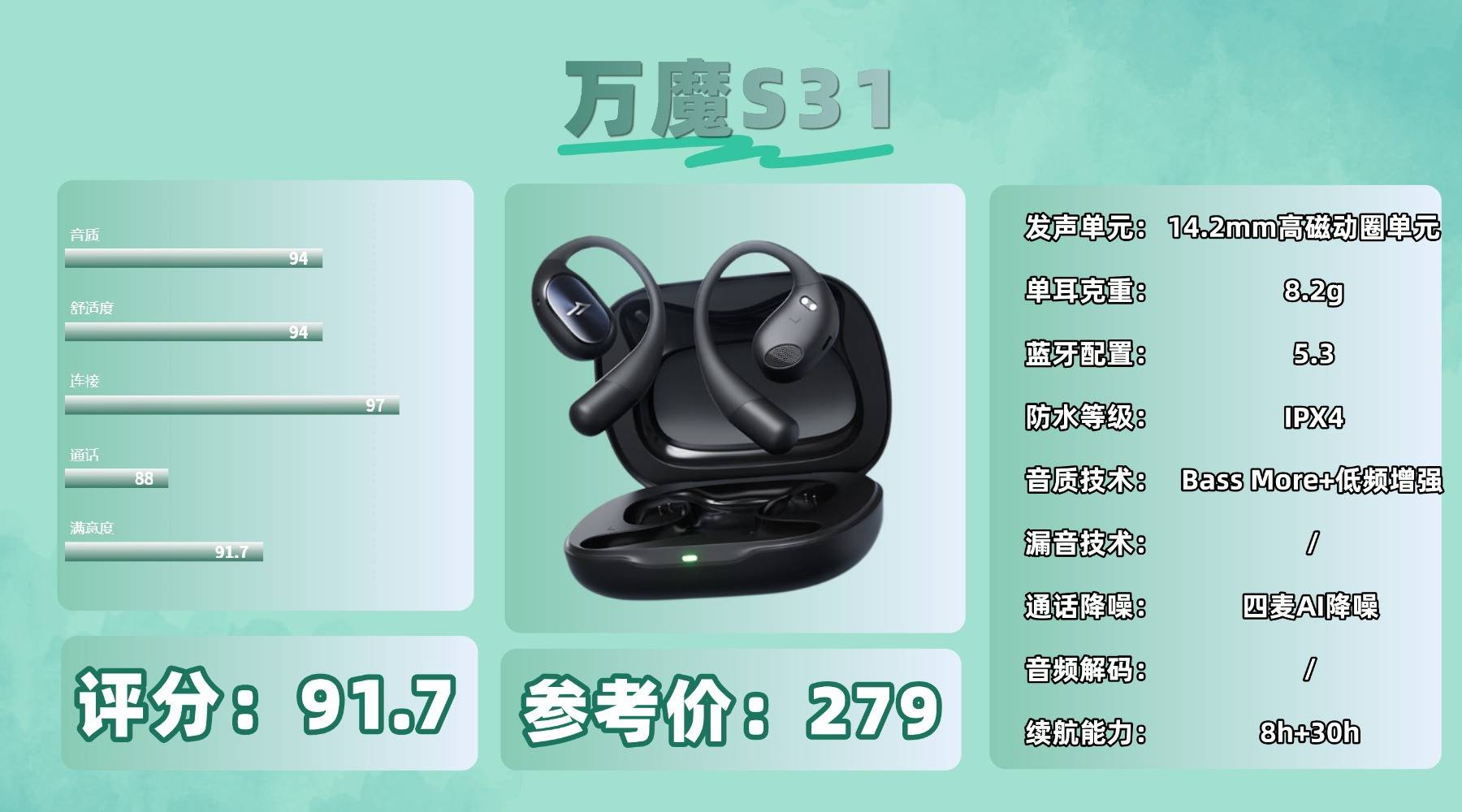 开放式耳机买什么好,S31 采用开放式设计,佩戴时通透不闷耳,适合长时间使用,但听筒贴合度一般,导致低频下潜略显不足。14.2mm 动圈单元配合低频增强算法,声音饱满有力,尤其在流行曲或节奏型音乐中表现出色。高频延伸略弱,细节表现不算突出。通话方面,在安静环境下人声清晰,但在户外或有风时容易出现风噪,对方可能听到背景杂音。