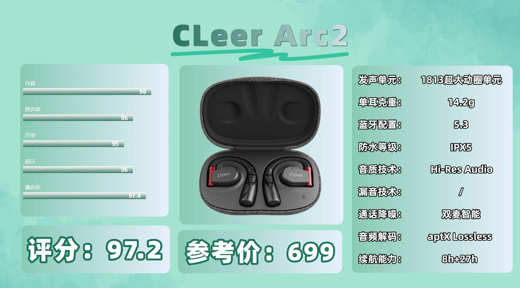 开放式耳机买什么好,A rc 2 的设计在开盖处增加了凸起,单手操作更方便。耳机重量达 14.2g,若搭配眼镜使用可能略有夹耳感。音质采用 16.2mm 大动圈与 DBE 动态低频增强技术,低频表现饱满有力,电子类音乐氛围浓厚;但中高频细节略显平淡,人声通透感稍弱。支持 aptX 解码,搭配骁龙手机音质表现更佳。蓝牙 5.3 提供稳定连接,App 内含 EQ 调节与体感控制等丰富功能,不过部分功能需依赖特定设备才能完全体验。