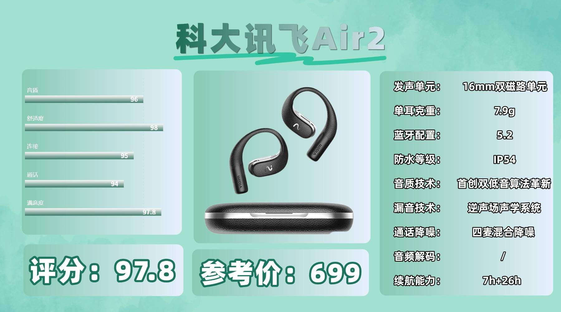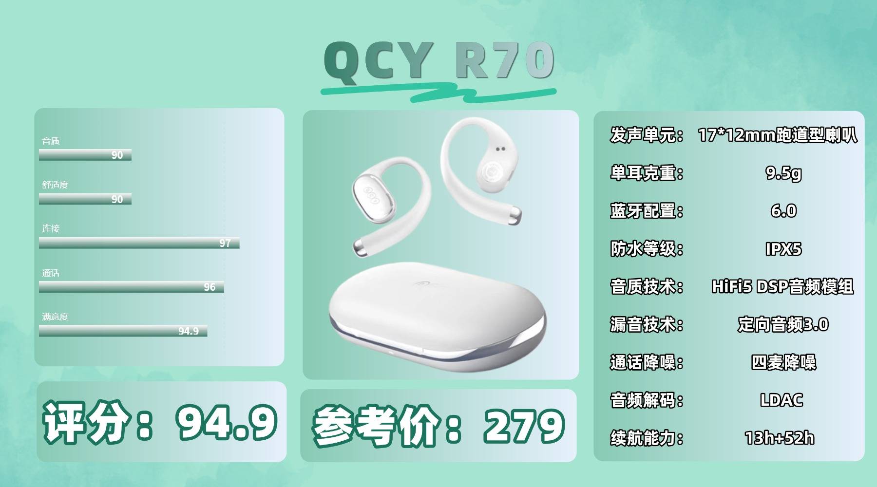 开放式耳机买什么好,这款单耳仅 9.5g,搭配 Air 超细悬浮耳挂和 35.6°黄金贴合夹角设计,佩戴稳固且对耳廓压力较小,但由于耳挂结构较硬,长时间连续佩戴略显疲劳。搭载 17×12mm 三磁超线性跑道单元,低频弹性不错,同时通过双重防漏音设计有效控制外泄。不过在高频部分延展性稍弱,不太适合追求高频解析的用户。采用蓝牙 6.0,连接稳定抗干扰能力强,四麦降噪在嘈杂环境下通话清晰。续航表现也不错,并支持无线充电。但充电仓体积略大,放在口袋携带时会有一定厚重感。