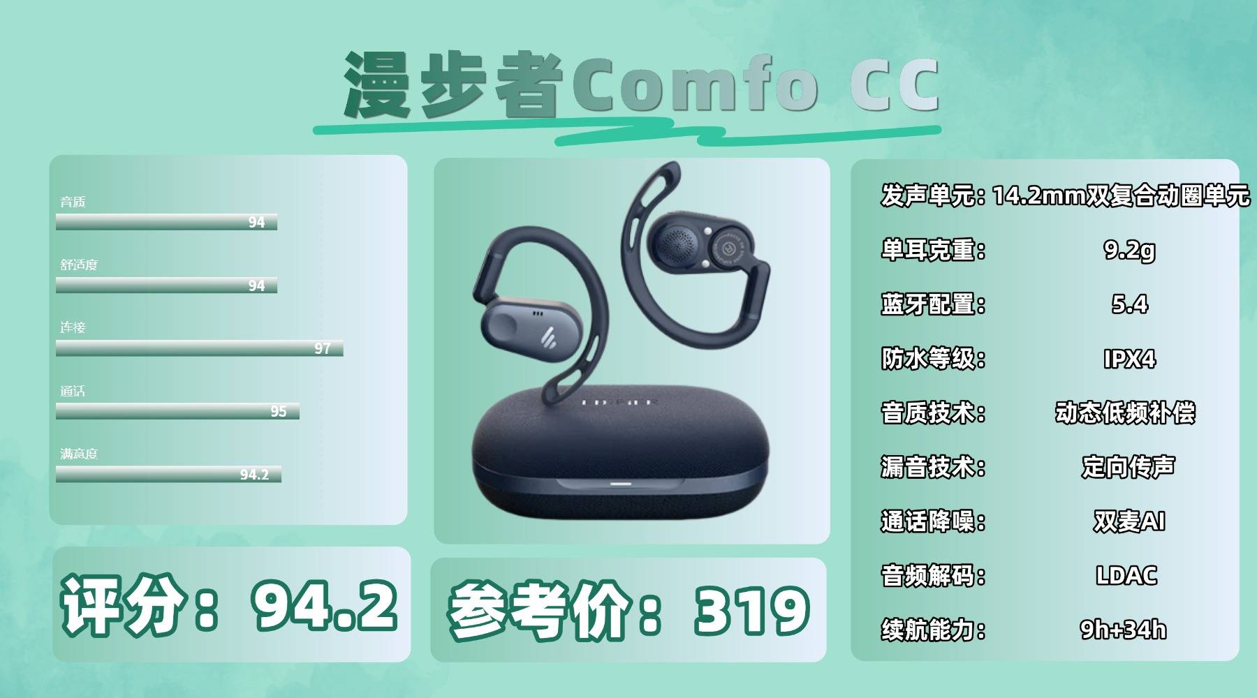 开放式耳机买什么好,Co mfo C C 的单耳重量略高,佩戴短时间无明显负担,但长时间使用可能会稍有压耳感。音质上搭载 14.2mm 双复合动圈单元,配合 LDAC 高解析传输,对乐器层次的还原相当细致,在多乐器编曲下依然清晰分辨。不过声场略偏集中,空间感不足,观影时环绕效果略显局限。配置方面,采用蓝牙 5.4,信号传输顺畅;单次续航约 9 小时,配合充电盒可达 34 小时,总体续航表现稳定可靠。