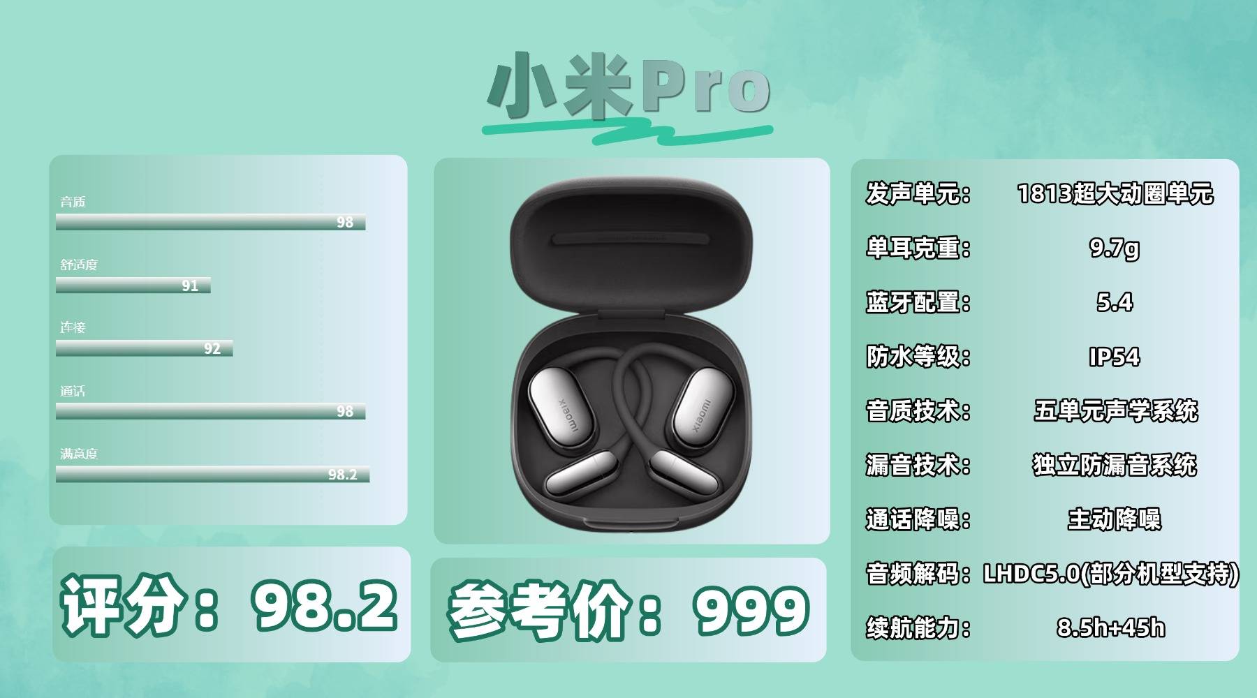 开放式耳机买什么好,小米Pro单耳9.7g,重量中规中矩,耳挂采用硬质材质,初次佩戴需手动调整角度,长时间通勤后耳廓略有压迫。音质部分采用三单元结构(1813大动圈 +双动铁 +压电陶瓷单元),三频均衡度较好,中高频解析力出众,但低频下潜略浅,缺乏冲击力。搭载 LHDC5.0,声音细节保留更到位。功能上配备蓝牙 5.4,连接稳定;主动降噪在大多数场景下表现理想;具备 IP54 防护等级,防汗防雨。续航约 8.5 小时,配充电仓可达 45 小时,整体使用周期充足,但游戏延迟控制一般。