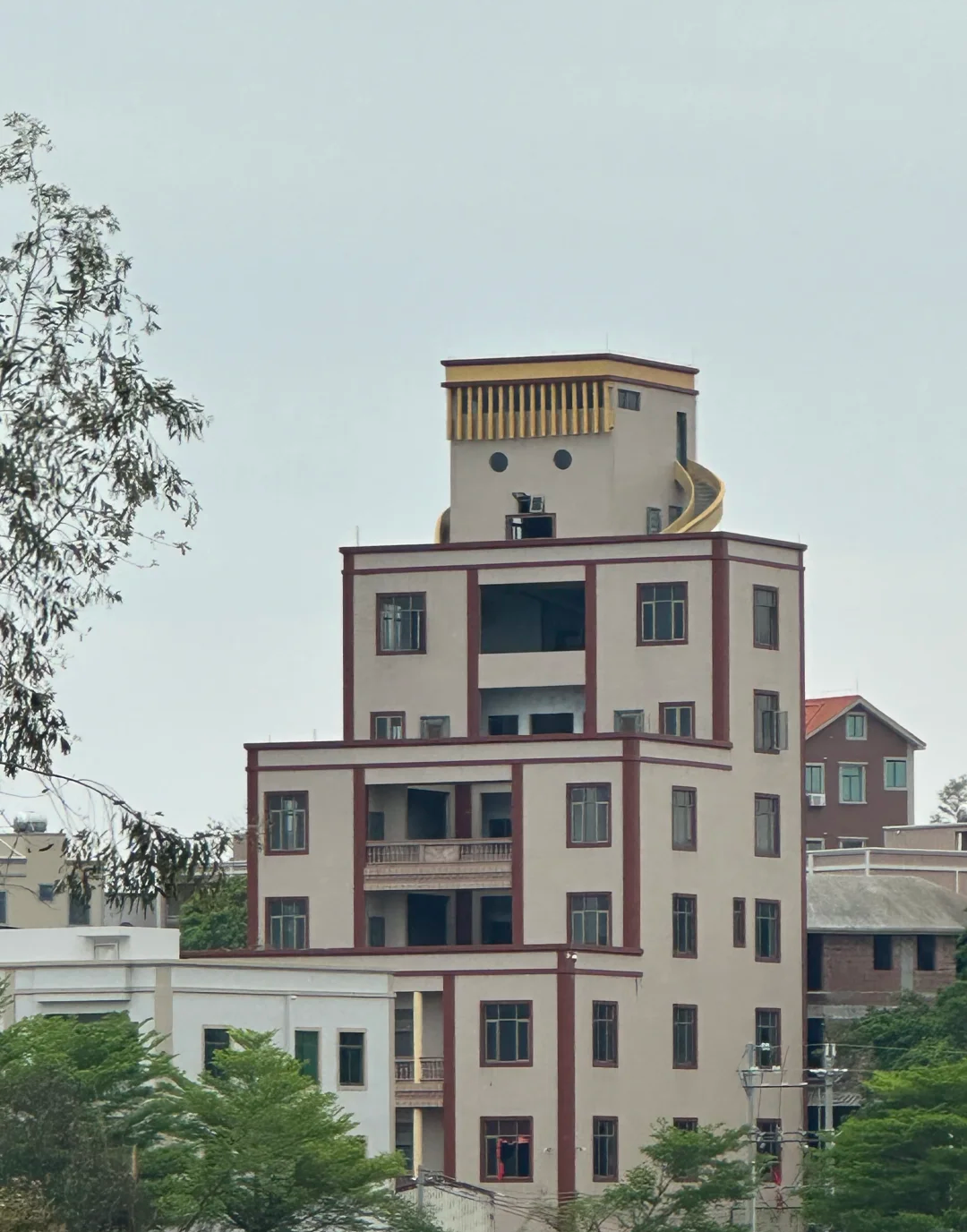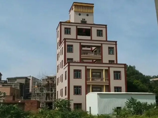 在广东吴川覃巴镇留雄村,一栋 8 层建筑矗立在村落间,远远望去,竟如一位 “帝王” 端坐于山野 —— 顶楼的小屋是 3D 立体头颅,16 根金柱撑起珠链状 “皇冠”,窗棂雕琢成五官,两侧偏房像龙袍广袖…… 这栋花费 500 万、由 “高人” 设计的别墅楼,建成后却因外形太过 “意外”,成了当地最具争议的网红建筑。