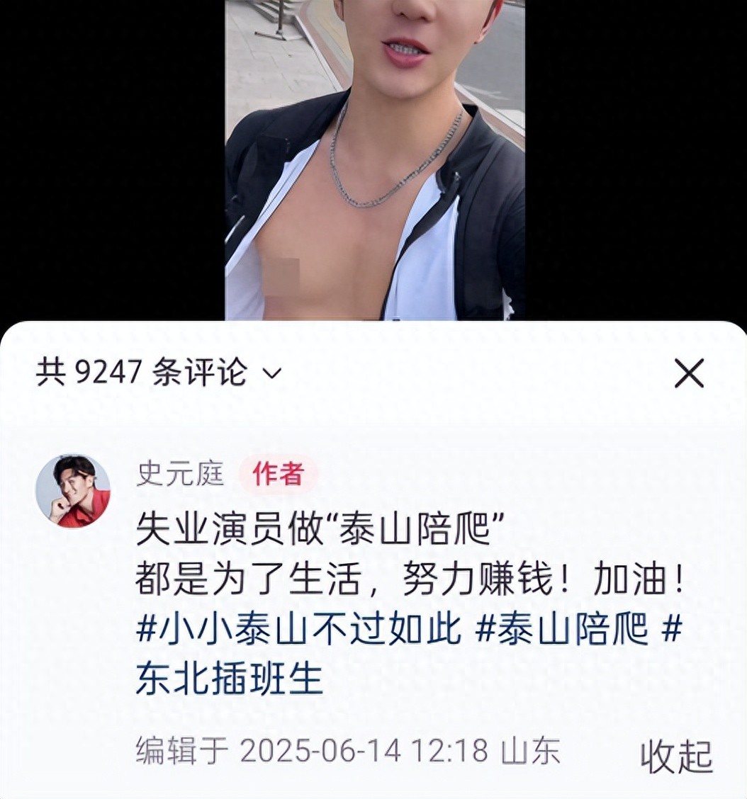 “都是为了生活,努力赚钱!加油!”近日,曾在青春搞笑剧《东北插班生》中饰演主角王虎的东北演员史元庭发视频表示,今年接戏比较困难,找了个兼职做泰山陪爬。