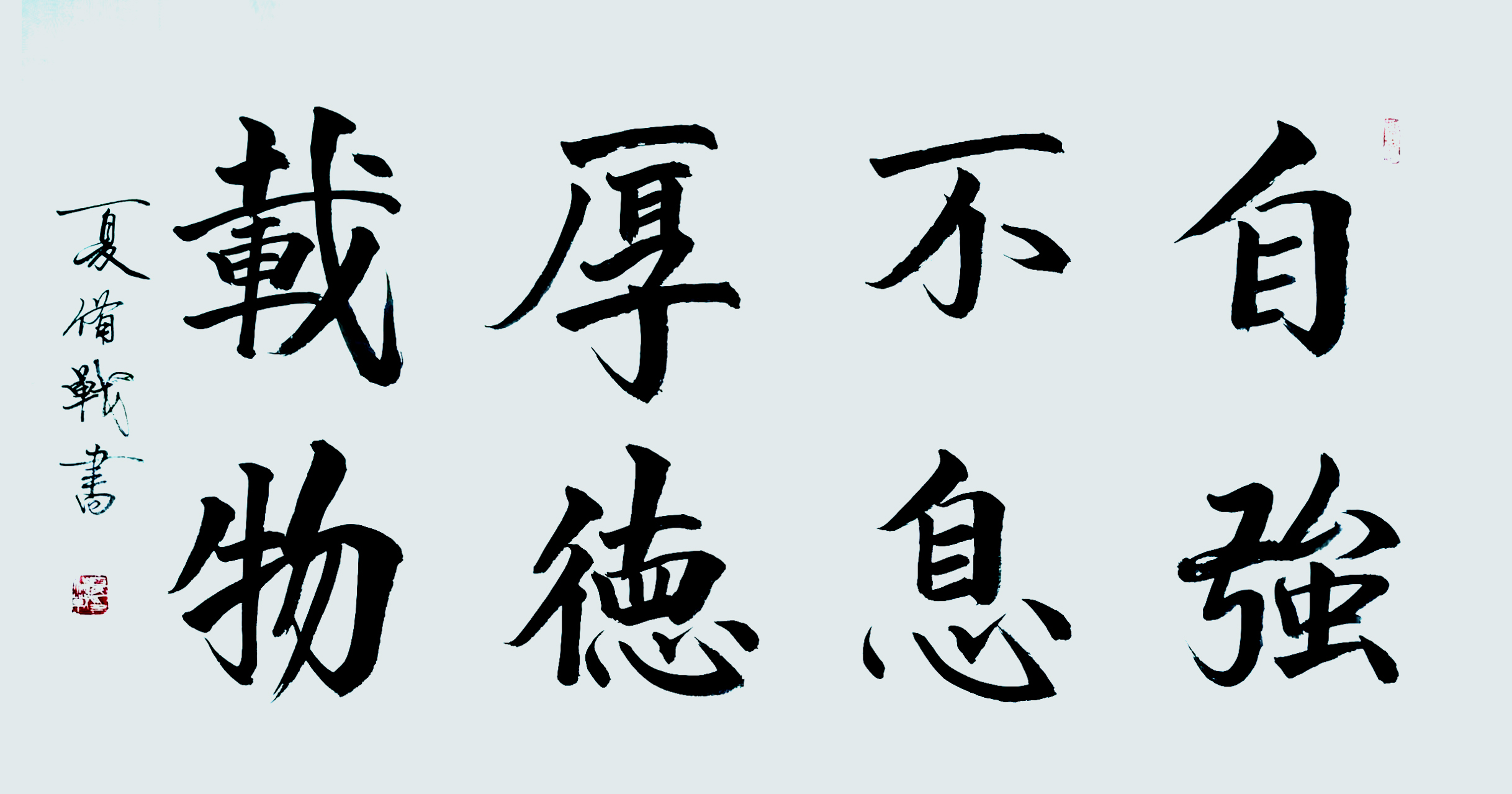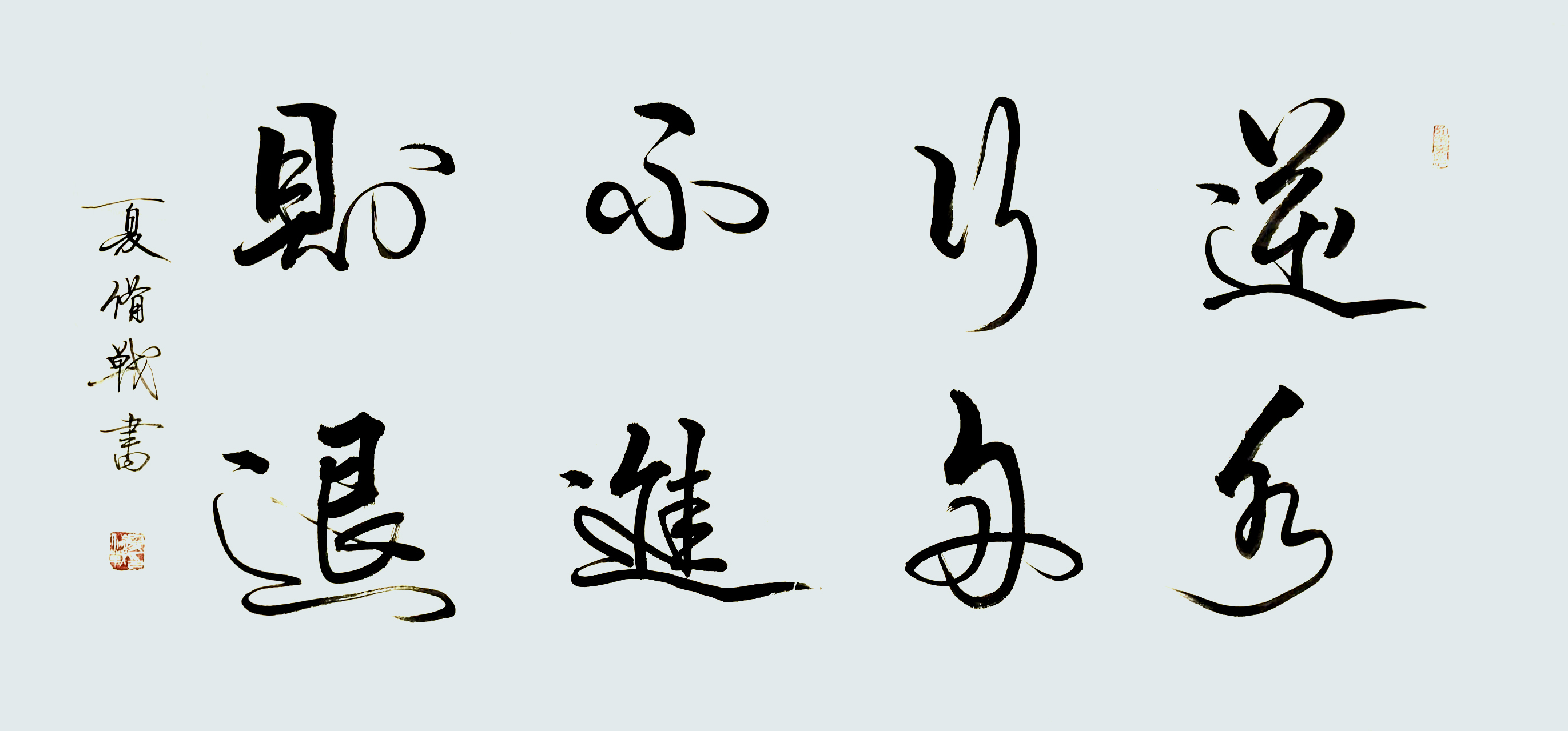 就以他的几幅八字箴言横幅作品来看,书中他所主张的,显然就是“一点成一字之规,一字乃终篇之准”的挥毫之道。用笔时,力道遒健而不失于游动,是谓外有千钧之力,而内有纤巧之韵也。不得不说,夏备战先生是将“正大”与“灵动”结合的十分完美,字字纤锋往来,播布研精,婉时若银钩,源时若惊鸾,既知停匀则求变化,也见斜正疏密错落其间,由此一幅观之,真可谓是书卷气浓。行书笔意兼楷法,清刚雅正自非凡!
