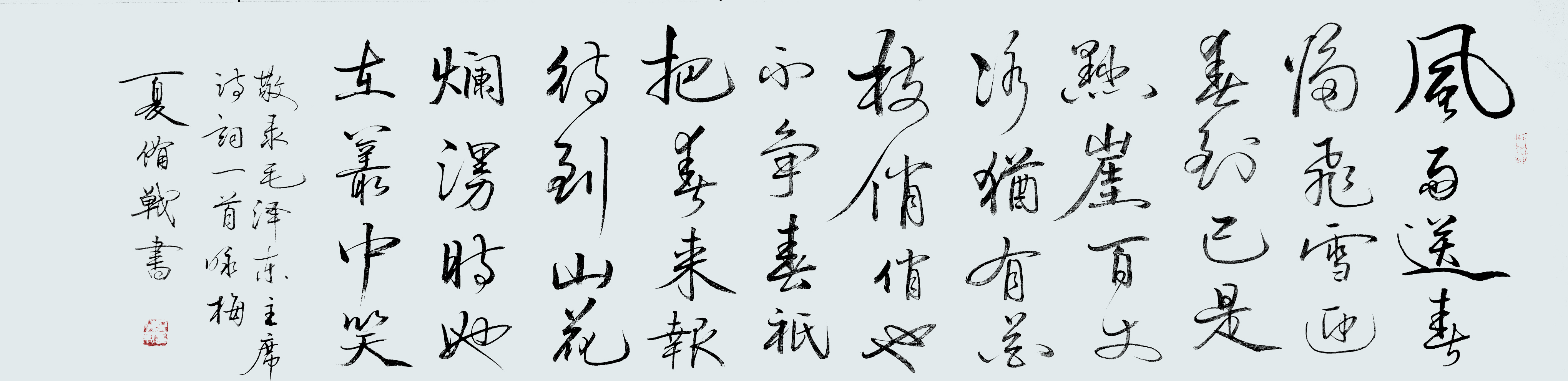 对于夏备战先生来说,书法不仅是其抒怀胸襟的文化载体,同样也更是他实现艺术抱负的重要途径。初次看到夏备战先生的书法作品,首先能感受到的,便就是一种博学多识的文人气概,而这无疑也是他多年来深耕传统文化、不懈修炼的成果体现。仅在师古道路上,夏备战先生就曾先后取法于百家书风,如前人二王、颜鲁公、米芾、怀素,近代启功等等,此诚是一字一笔皆从帖学中来,久久揣摩,继采诸美,如此自然胸中餍饫,挥毫精熟也!而在如今“展览体”书风日益盛行的时代背景下,夏备战先生这种取法正宗的创作典范,无疑也是具有着相当重要的示范性意义。