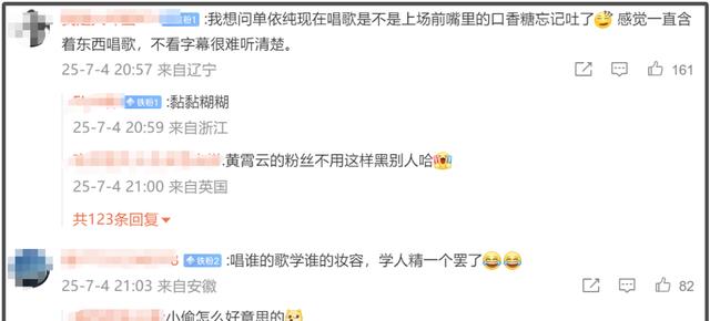 《歌手2025》第八期播出完毕,单依纯依然是节目组最大流量,但歌声评价越来越糟,嘲讽其模仿王菲唱腔的声音只增不减,演唱《梦一场》直接被吐槽像是王菲在唱那英的歌,一下子又“碰瓷”了两位天后。
