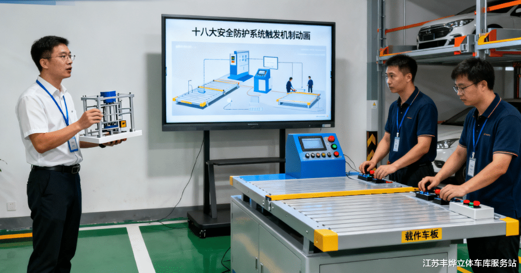 依托30000㎡现代化生产基地,江苏丰烨组建专业讲师团队开展现场教学。针对不同类型立体车库,从设备结构拆解入手,演示载车板升降、横移等核心操作,重点讲解十八大安全防护系统的触发机制与作用。在万达、碧桂园等项目现场,采用“手把手教学+模拟操作”模式,覆盖车辆入库对准、异常情况停机等关键环节,确保学员直观掌握操作要领。