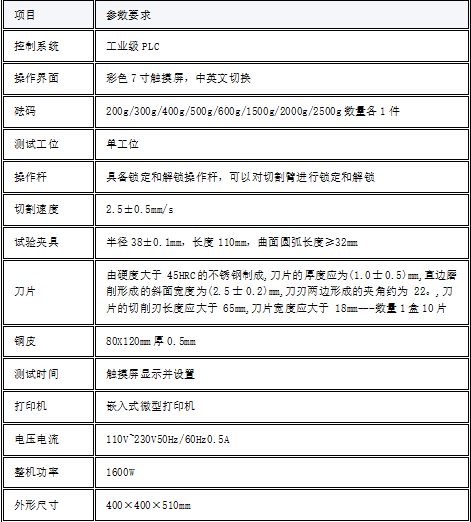 b)在刀片与试样之间施加选定的切割力,刀片接触试样 5s内开始试验,刀片切穿试样时的行程应为 5mm -50mm;在不同的切割力下,至少完成 15次试验,确保有 5次读数分别在5mm -15mm、15mm-30mm、30mm-50mm范围内;试样上的每次相邻的切至少相距10mm,且距试样边缘至少10mm,对于导电试样,应使用厚度不超过0.03mm的塑料膜进行绝缘。