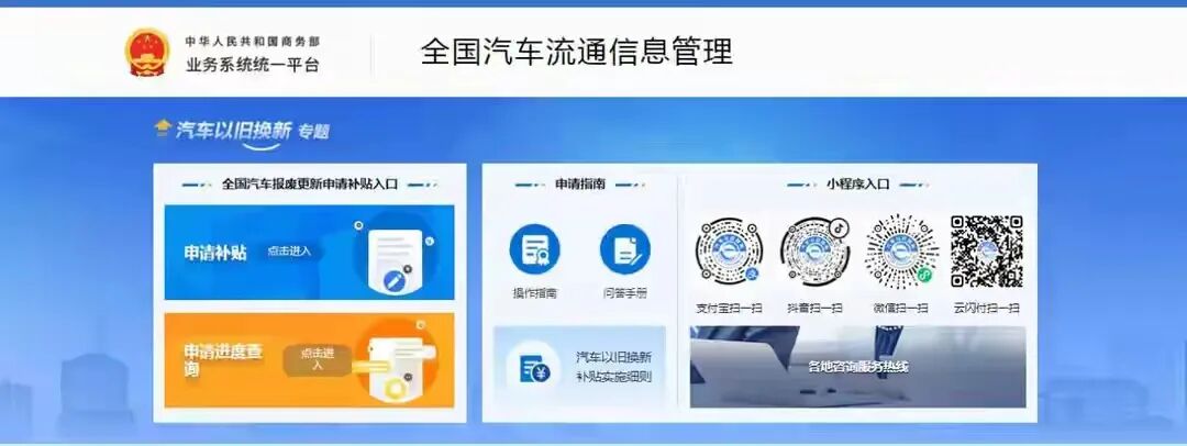 手续该怎么办?2025年全是线上办理,不用再跑部门递材料。手机上用微信、支付宝、抖音、云闪付这四个平台,搜“汽车以旧换新”小程序就能进入;电脑端可以登录全国汽车流通信息管理系统网站,从“汽车以旧换新”专题进去填信息。