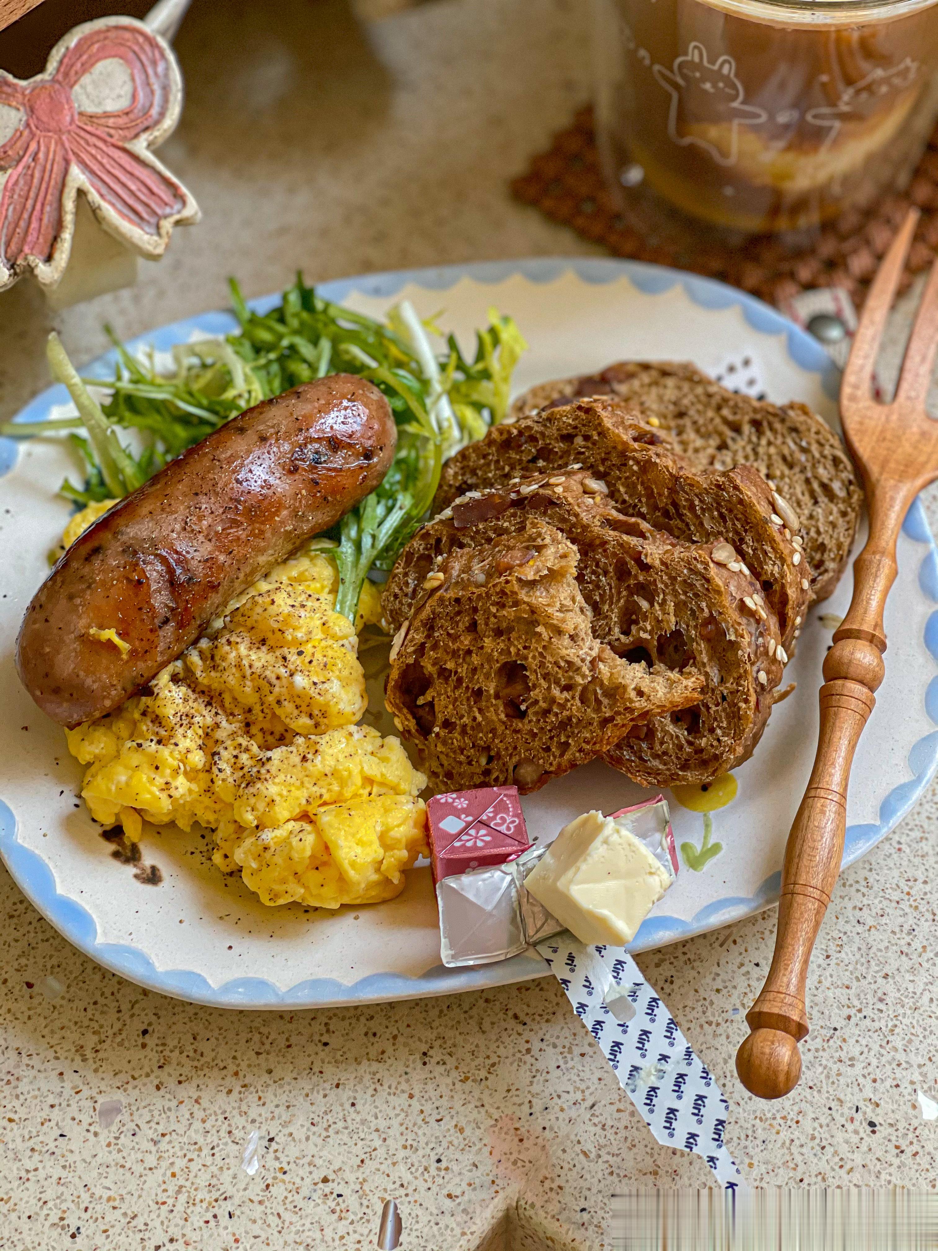 周三早呀[微风][微风][微风]今天吃谷物欧包+美式炒蛋+肉班长的香肠+kiri