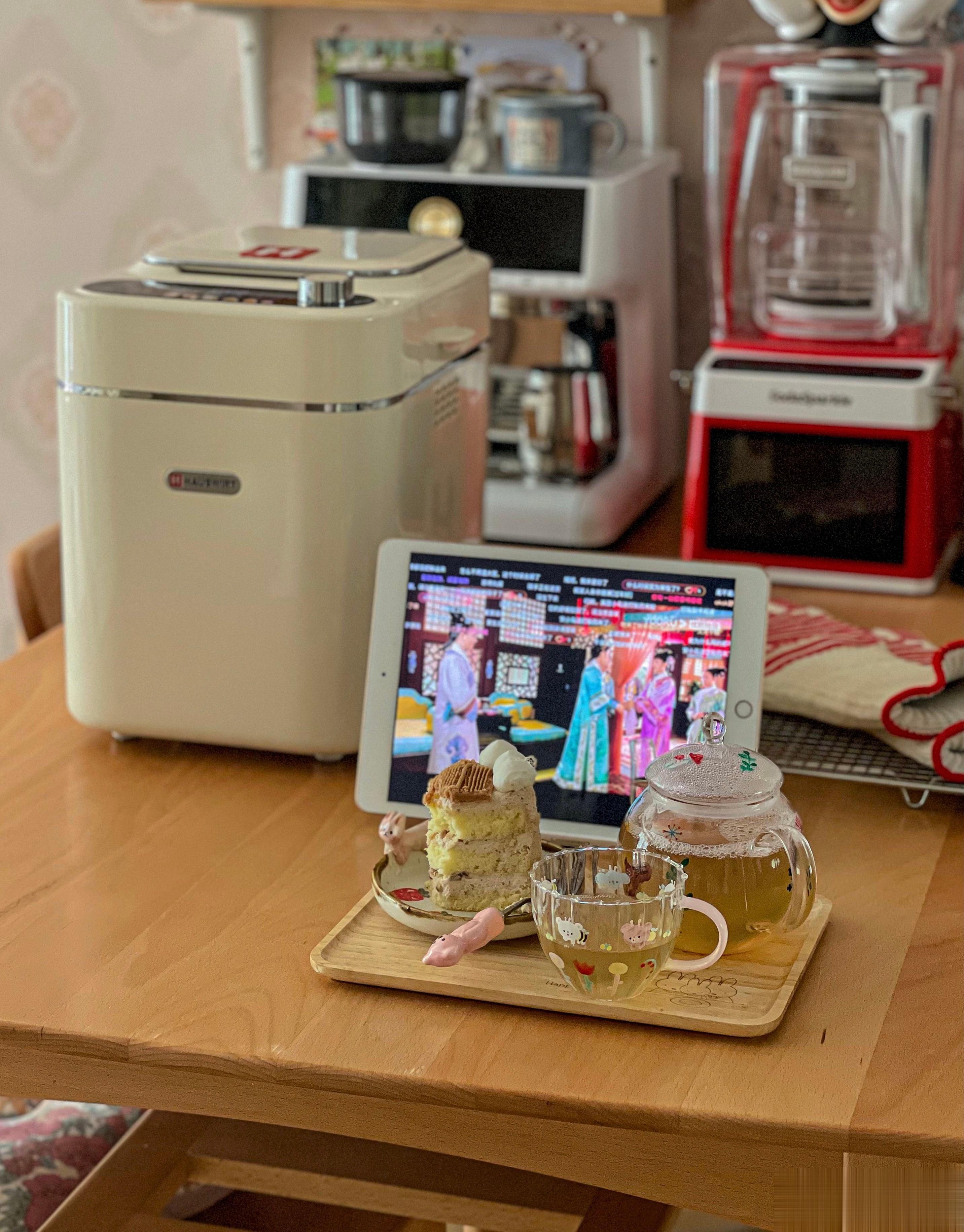 烤一只吐司烘烤ing!煮一壶茶,拿出昨天出去买的栗子蛋糕,边看甄嬛传边吃[哈哈]
