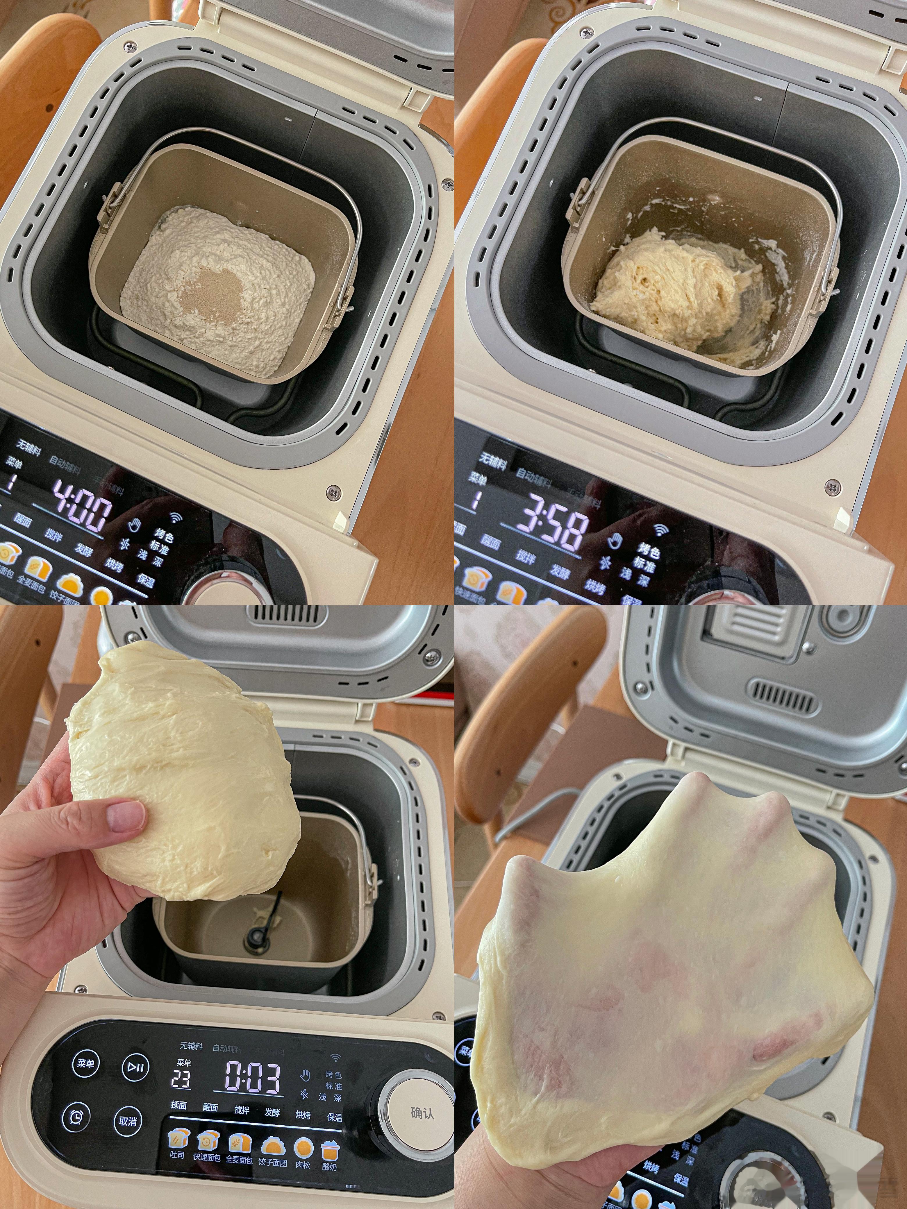 高筋面粉250克,奶粉15克,水130克,淡奶油18克,全蛋液18克,糖30克,盐3克,酵母3克,黄油25克。