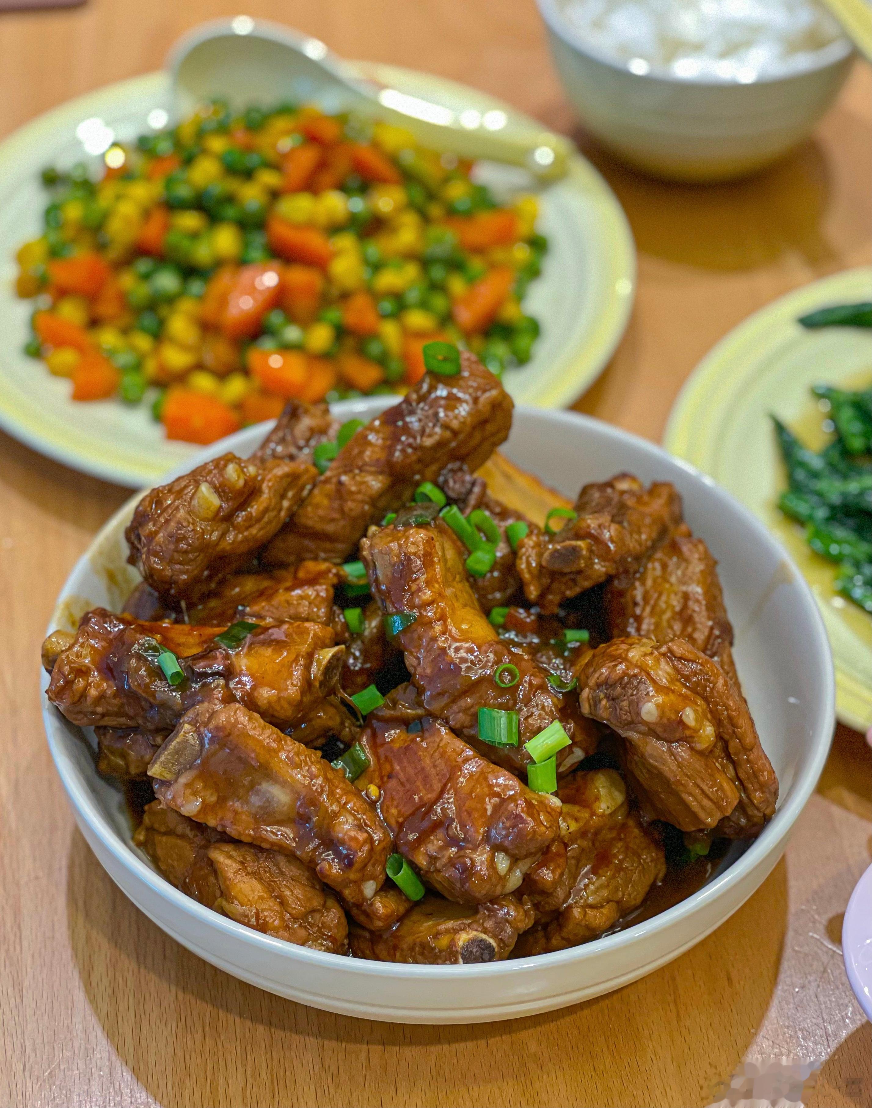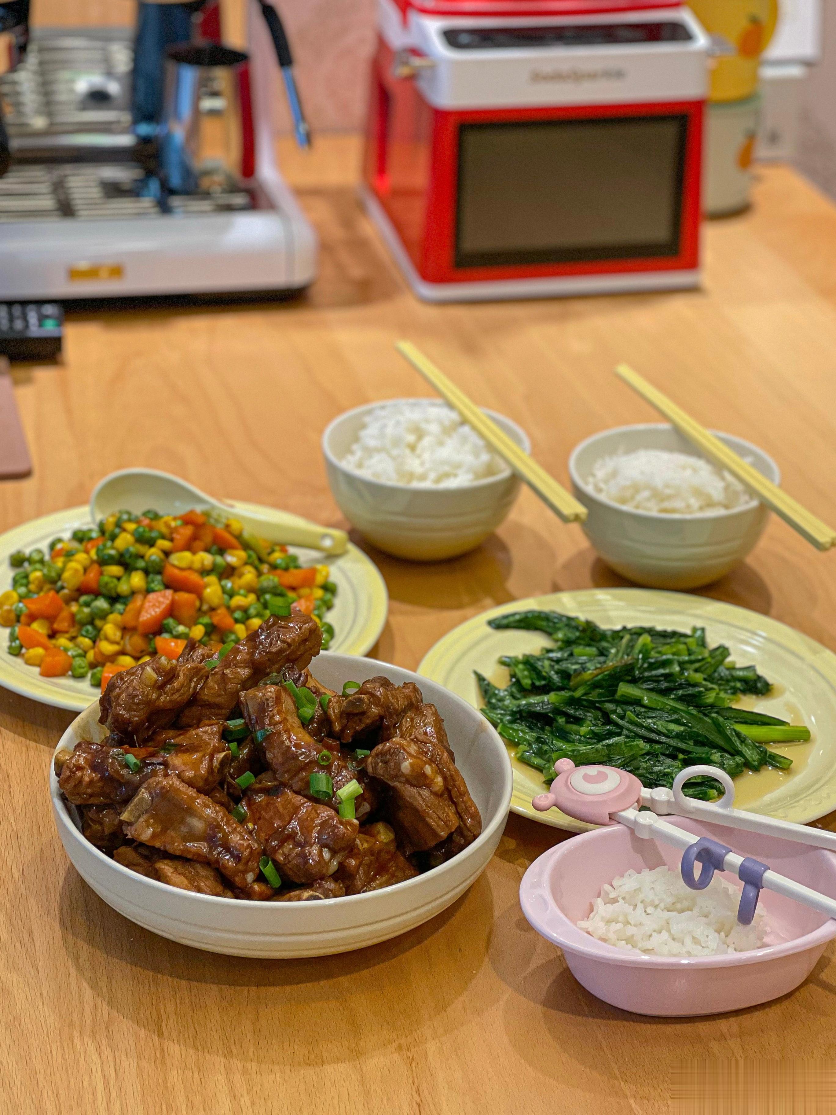 晚饭全家一起吃,丰盛一些[666][耶],做了红烧排骨,炒豌豆,乔乔特别爱吃。