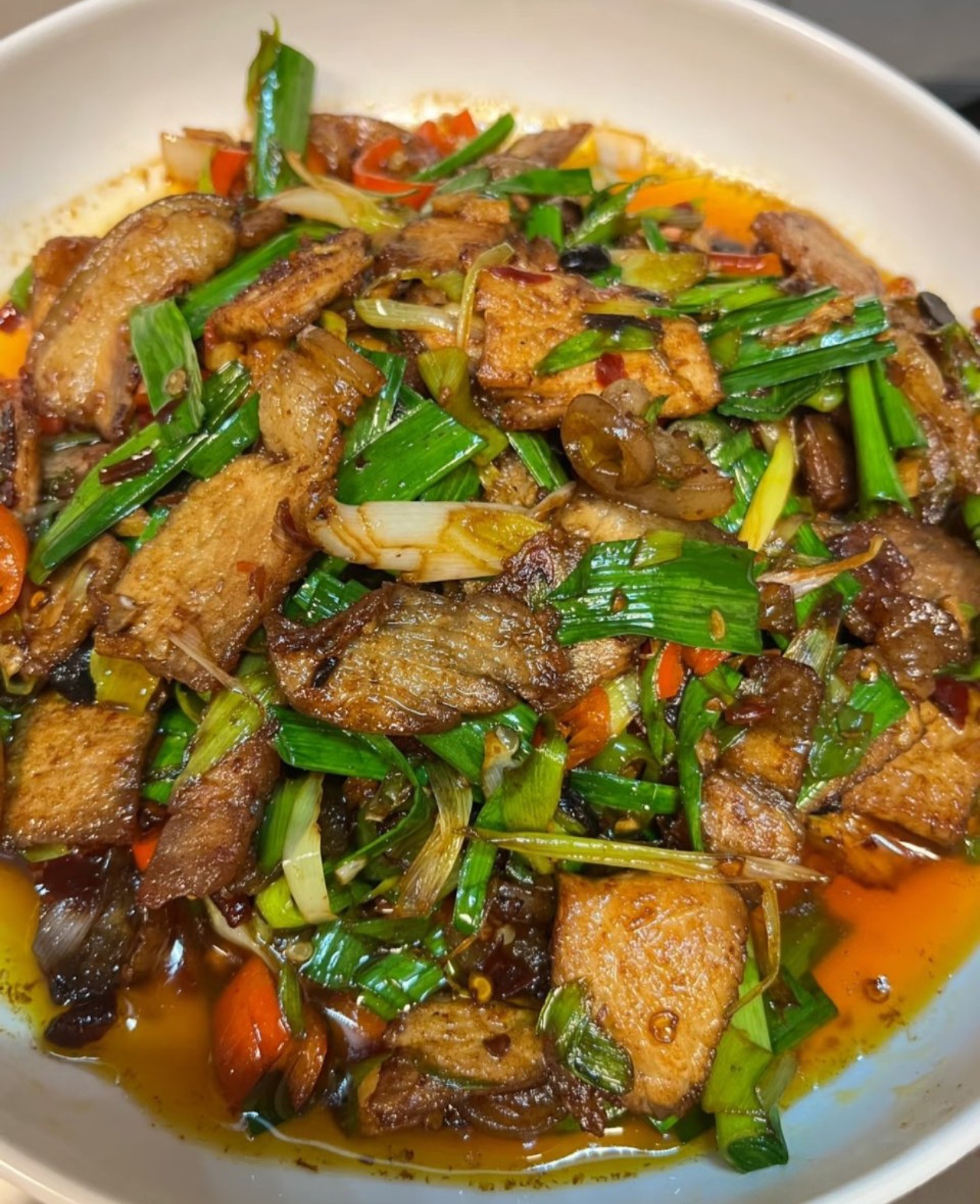 你看,这一盘油亮红润的回锅肉就做好了,肉片裹着酱色,混着青椒的鲜和蒜苗的香,夹一筷子送进嘴里,焦香中带着软嫩,咸香里裹着微辣,配着热米饭一口接一口,根本停不下来。