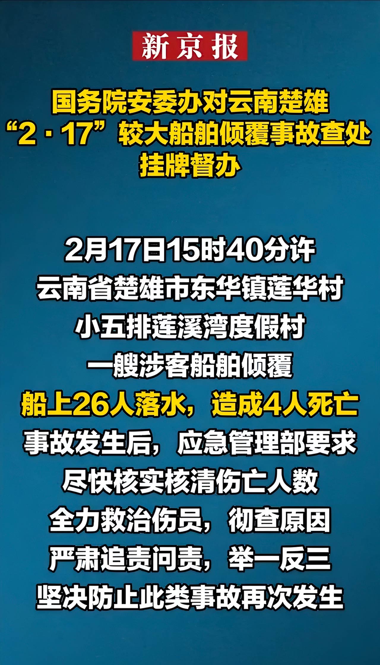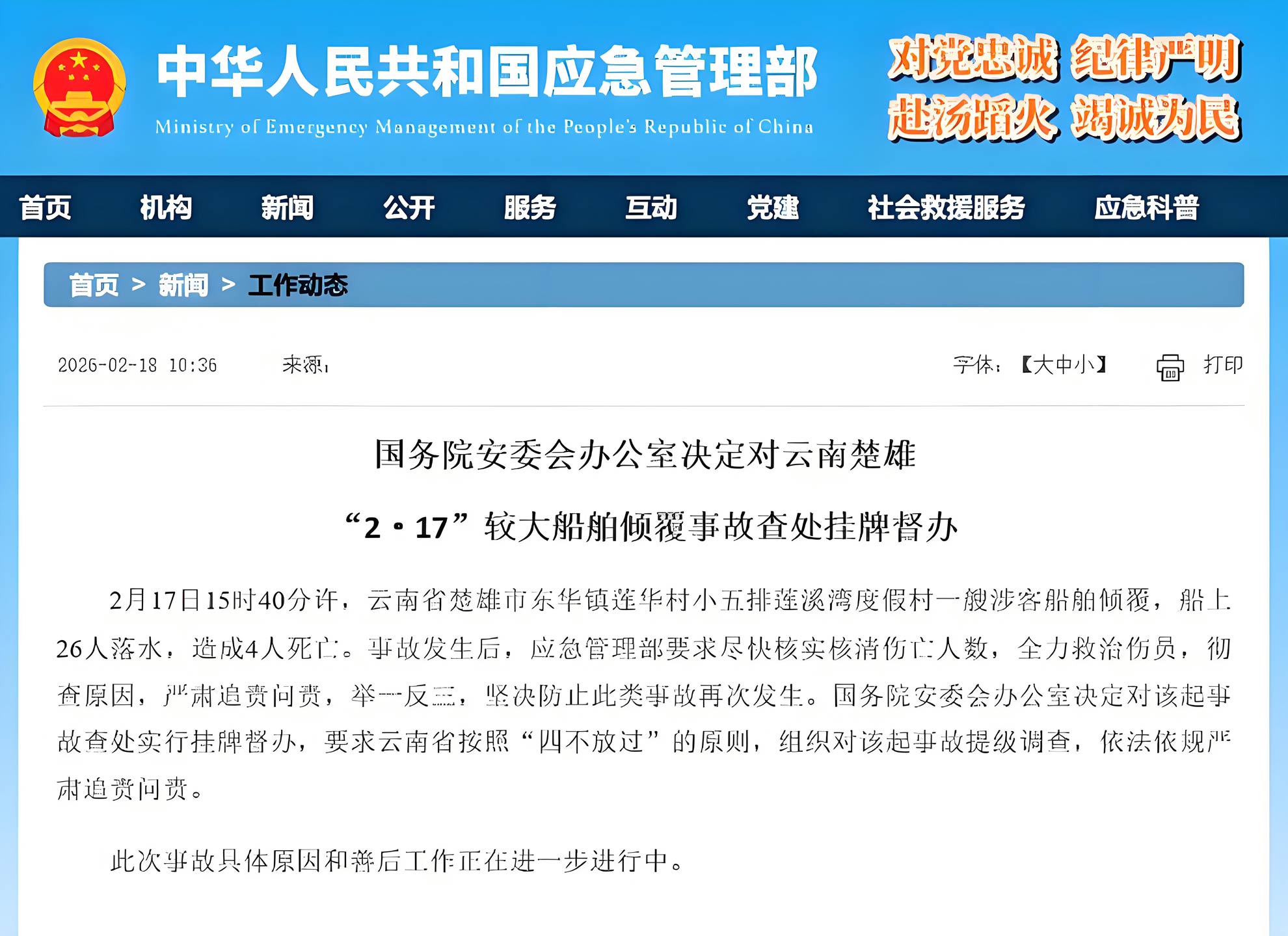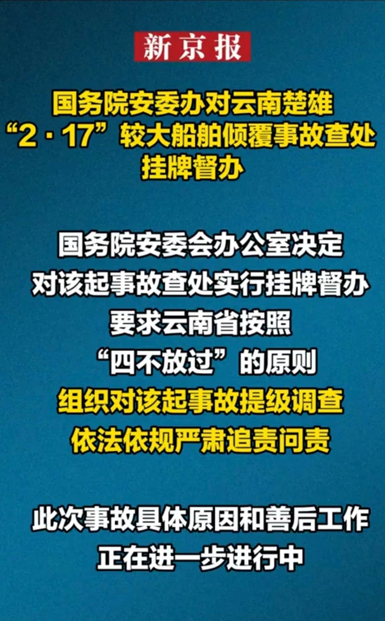 事故发生后,当地应急、消防等救援力量第一时间赶赴现场,全力开展搜救、伤员救治与善后处置工作。应急管理部要求全力做好伤员救治,彻查事故原因,严肃追责问责,坚决防范同类事故重演。国务院安委办已对这起“2·17”较大船舶倾覆事故查处实行挂牌督办,明确要求云南省按照“四不放过”原则,提级开展调查,依法依规从严追责。