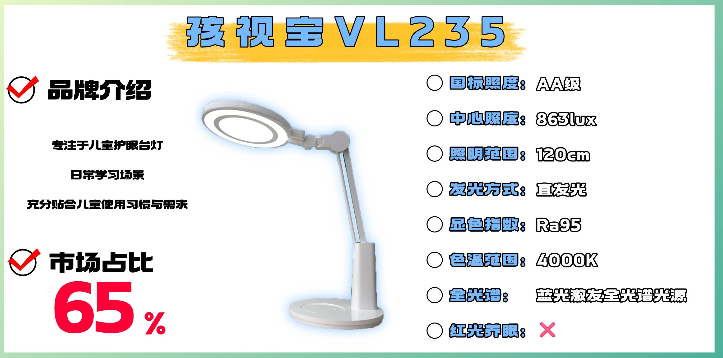 央视公布两款合格护眼灯是哪个品牌?孩视宝VL235台灯凭借简约大气的外观吸睛,圆形灯头与稳重厚实的底座搭配,线条流畅沉稳又不失现代感,适配书桌与办公场景。在光源设计上VL235采用18.8cm超大发光面,可以照亮1.2米以上的桌面。同时它还配备了温馨小夜灯模式,晚上也能体验到更加舒适的光线。不过需要留意,灯的调节角度不多,可能需要调整孩子坐姿来适应灯光