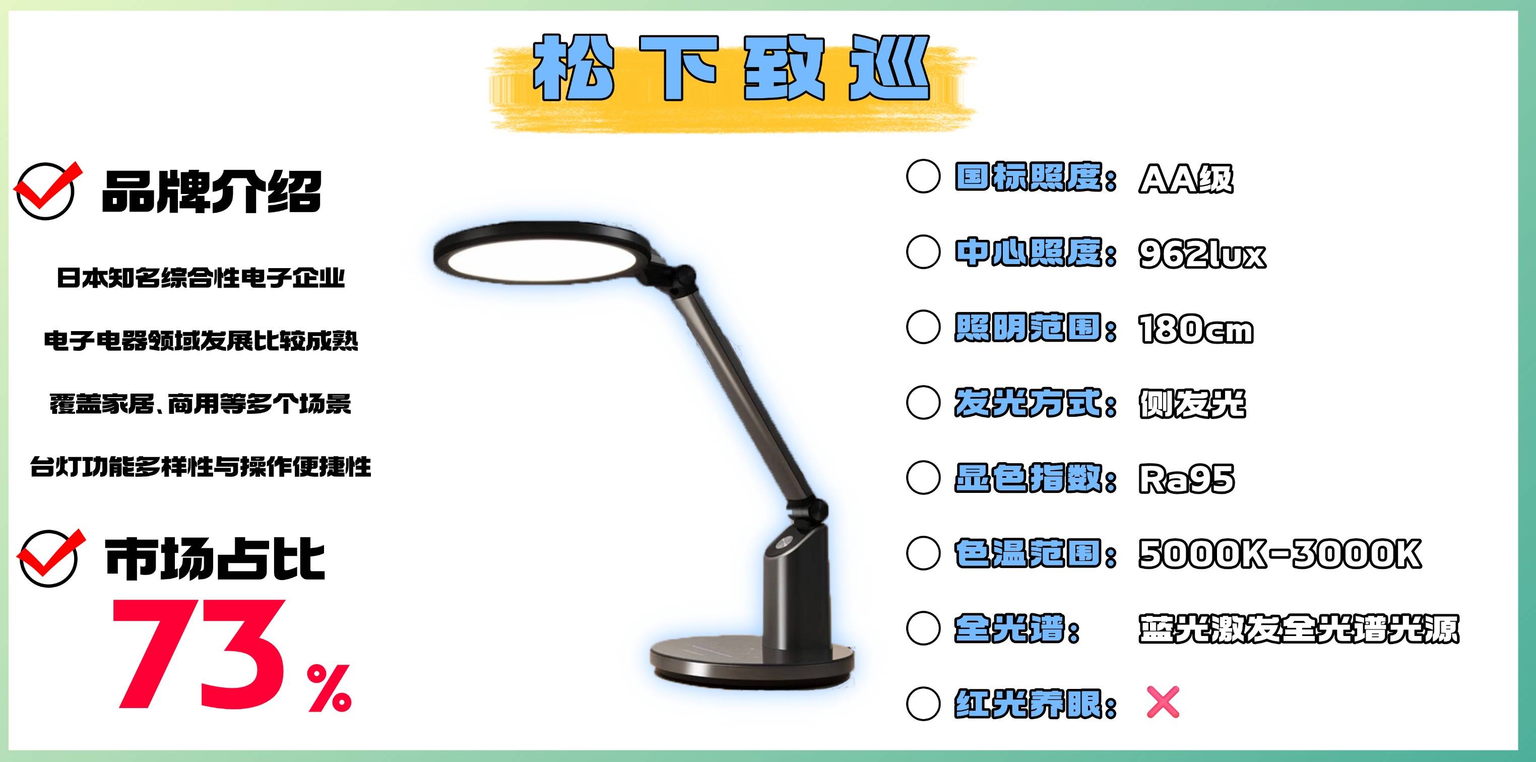 央视公布两款合格护眼灯是哪个品牌?松下致巡护眼台灯采用的是铝合金结合ABS塑料的材质兼顾了耐用与轻便,在材质上还有一个亮点是在底座上操作面上采用钢化玻璃,操作体验好。其发光面比较大有20.6cm,可以照亮180cm的桌面。其色温可调节的范围是3000K-5000K,覆盖冷暖光适配范围广。其功能较为丰富,有智能调光和延时关灯等模式。