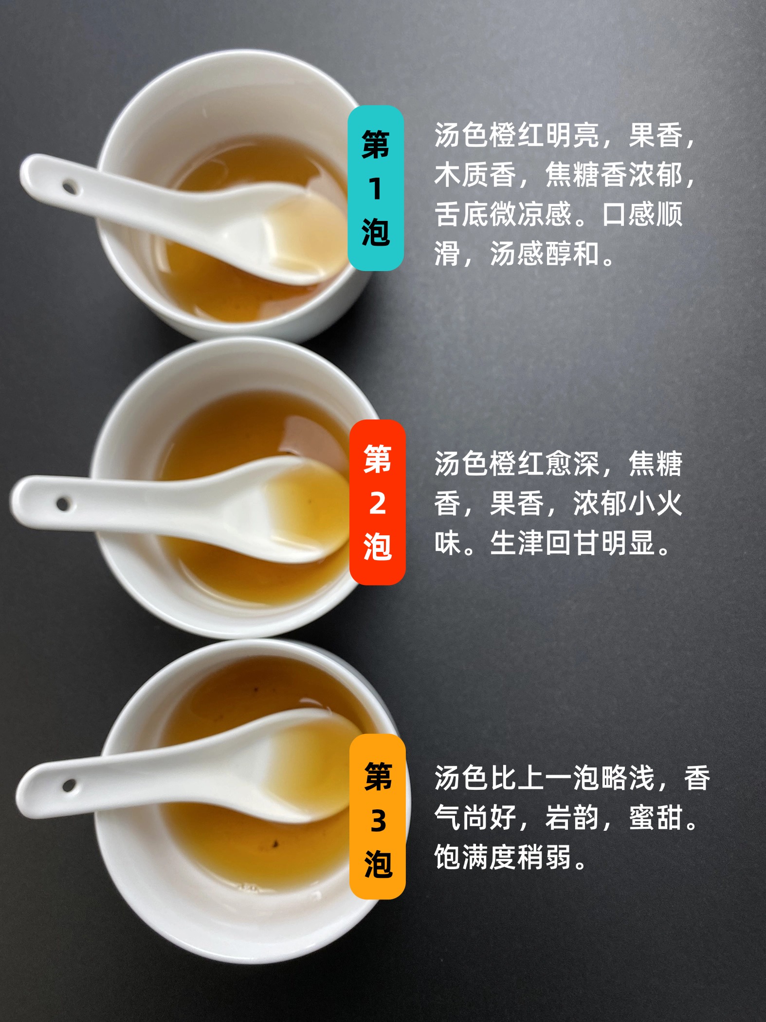 第一泡,汤色橙红明亮,果香,木质香,焦糖香浓郁,舌底微凉感。口感顺滑,汤感醇和。