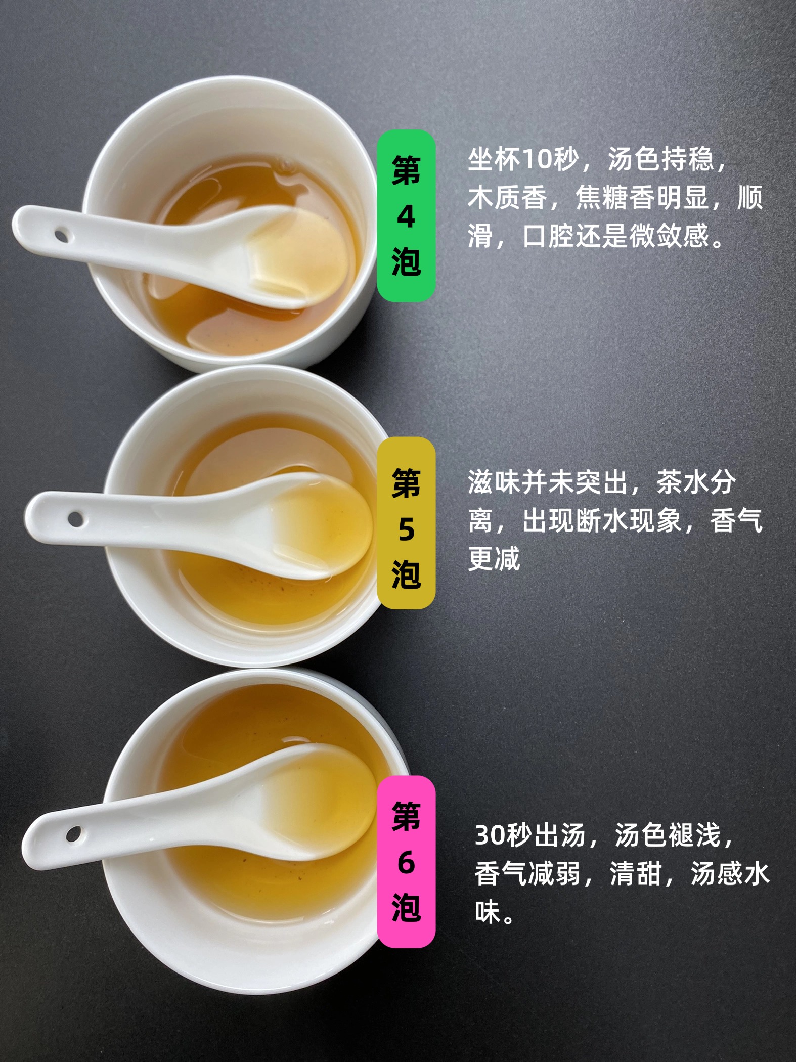 第四泡,坐杯10秒,汤色持稳,木质香,焦糖香明显,顺滑,口腔还是微敛感。