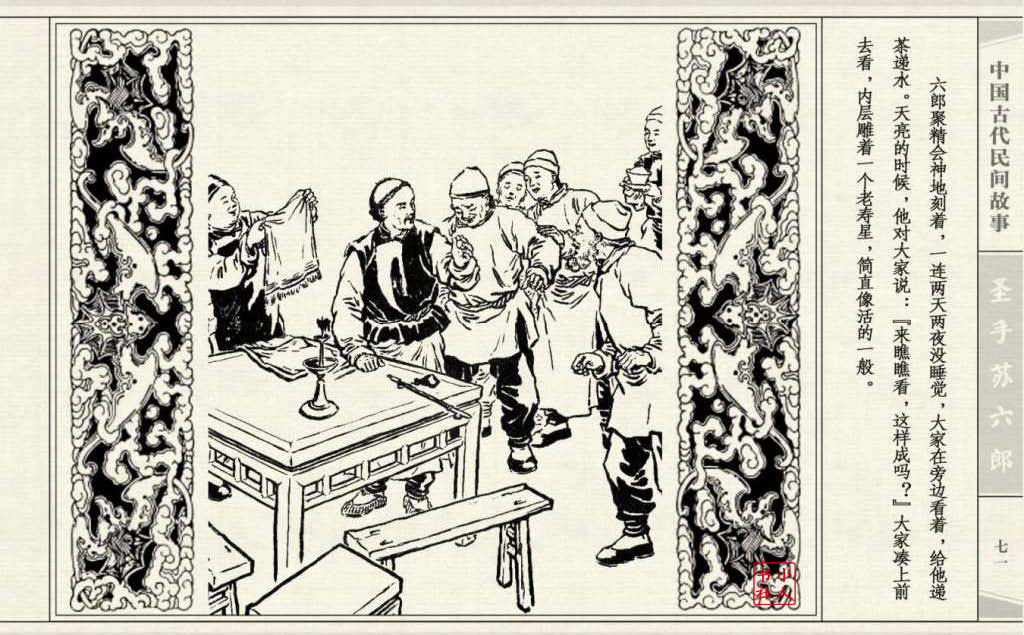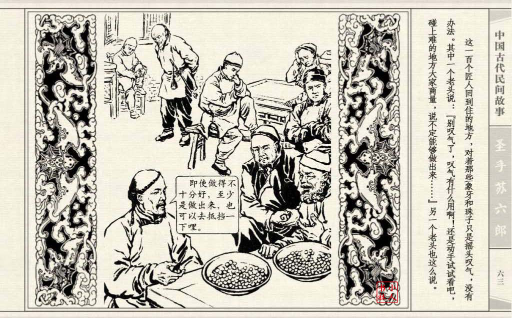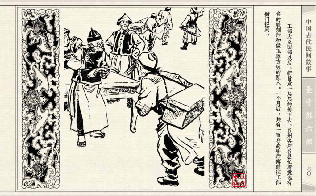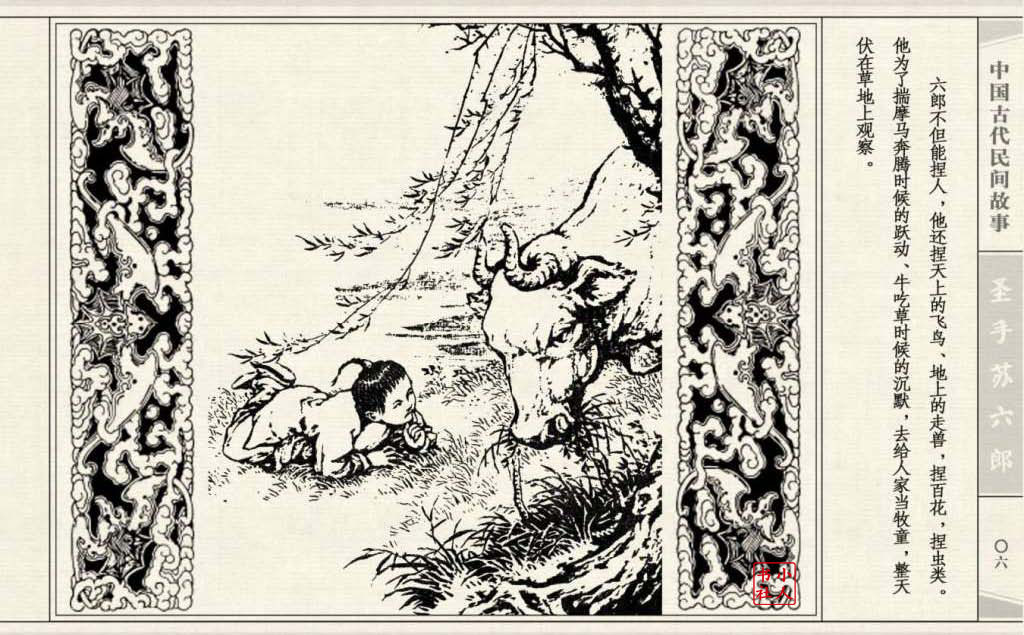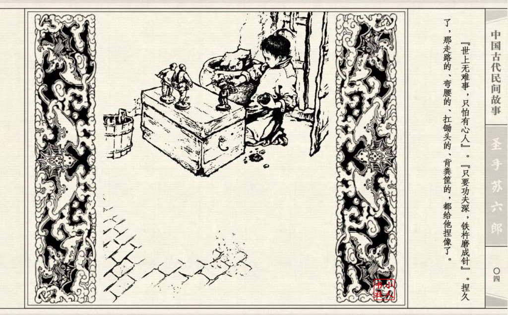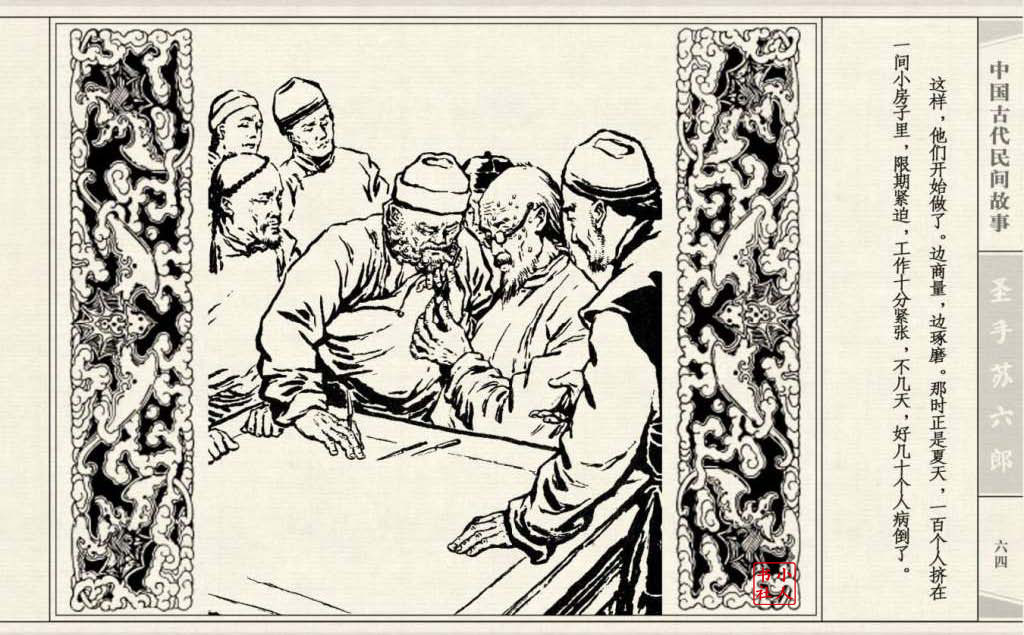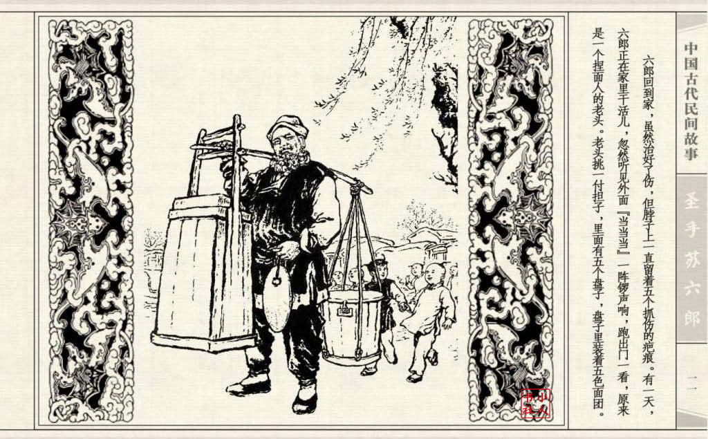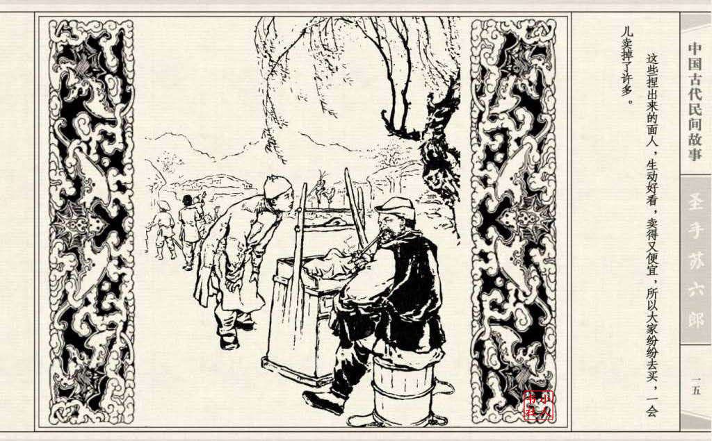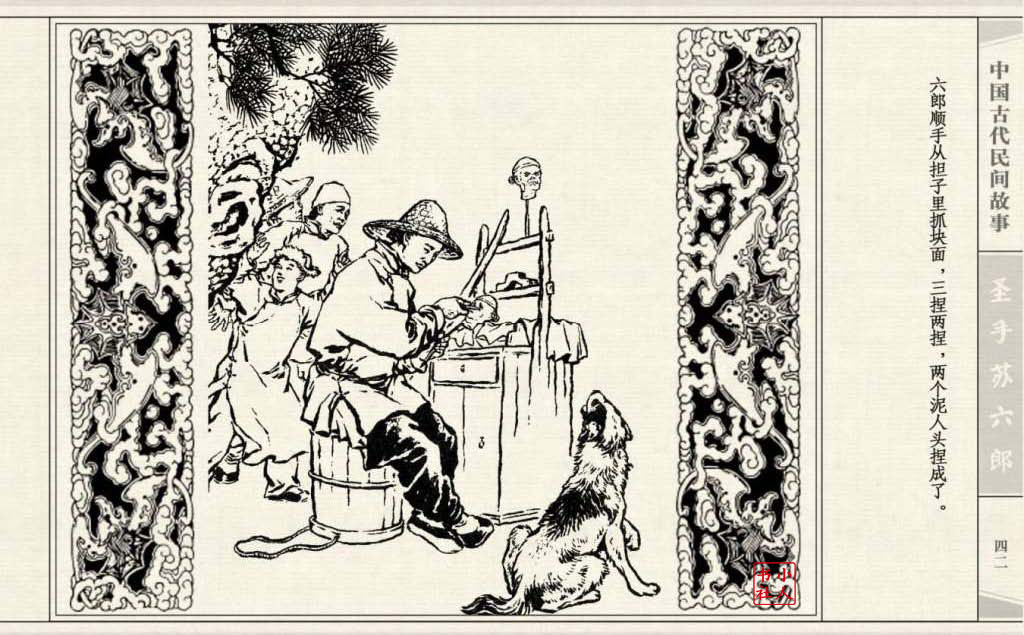 《圣手苏六郎》连环画是由管兴万改编,钱笑呆绘画。故事讲述苏六郎从小喜爱捏泥巴玩,而且到了痴迷的程度。一天,偶遇一位以捏面人为生的民间老艺人,执意要拜他为师。老艺人被他的诚意感动,收留了他。通过几年的艰苦磨练,苏六郎的技艺提高了,人也成熟了。他的技艺不仅是谋生之道,更是帮助穷人,讽刺,打击贪官污吏的武器。百姓们、同行的工匠们,有了困难,都愿找他帮忙。他的许多事迹在民间广泛流传。