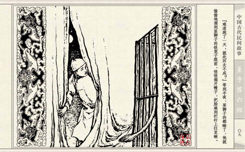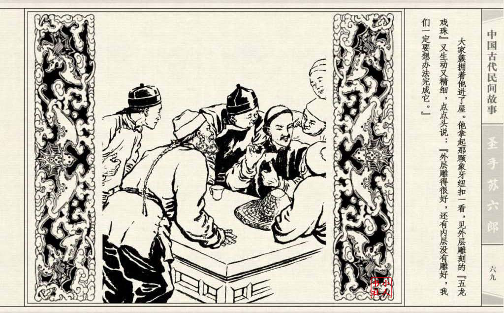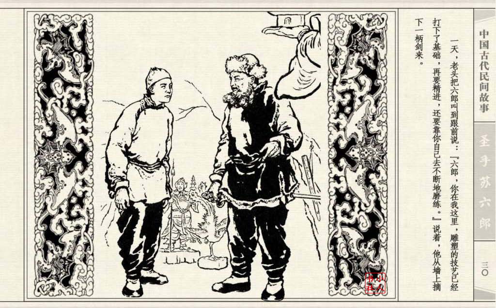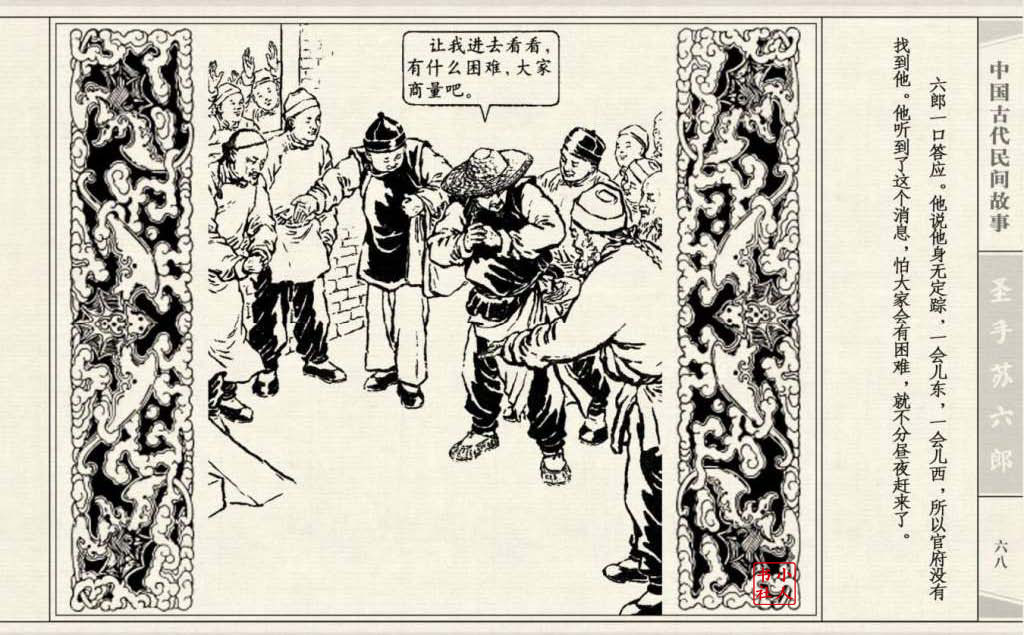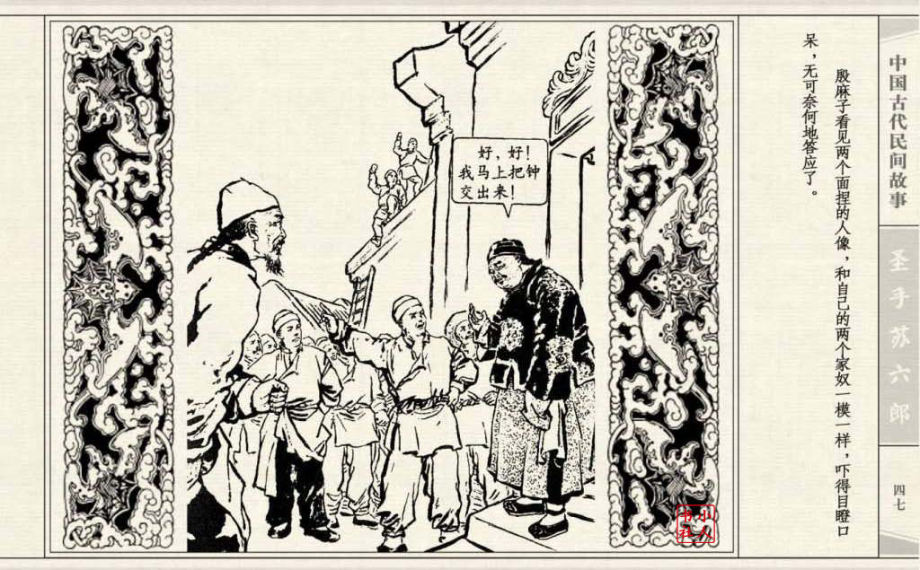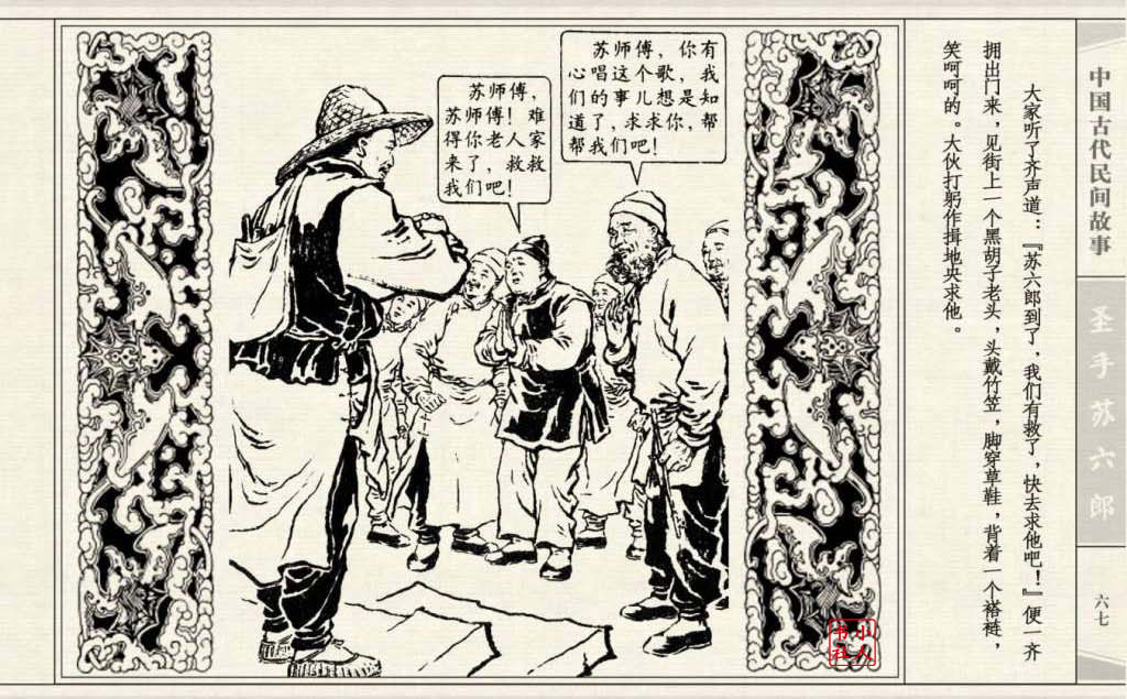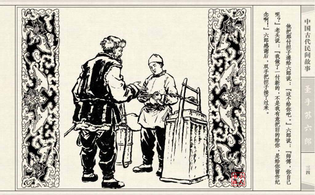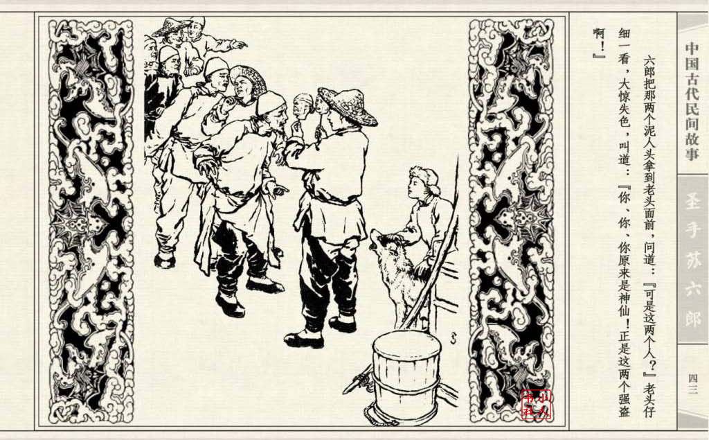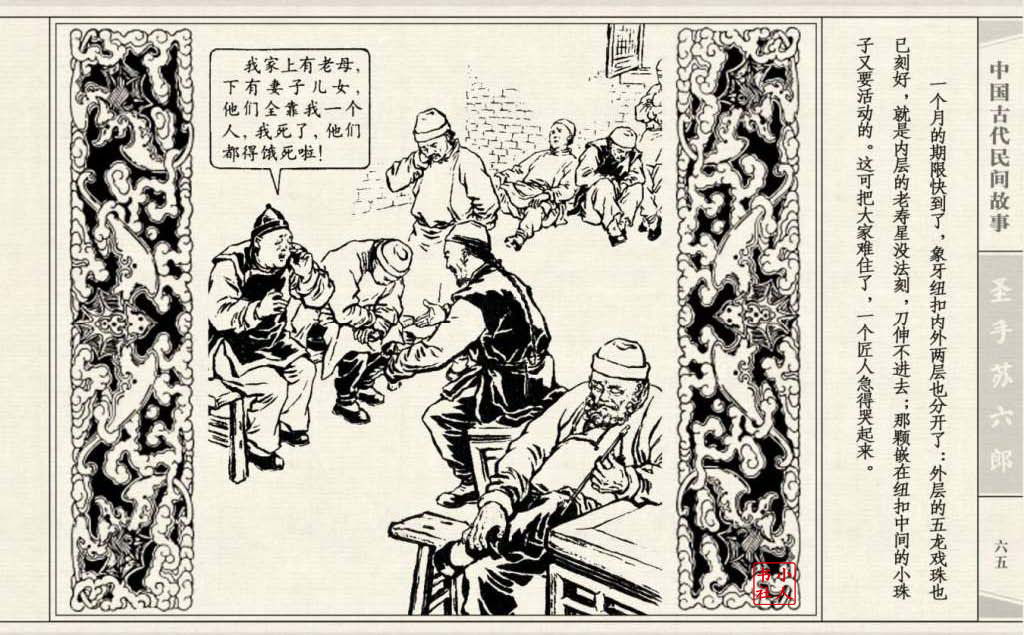 《圣手苏六郎》连环画是由管兴万改编,钱笑呆绘画。故事讲述苏六郎从小喜爱捏泥巴玩,而且到了痴迷的程度。一天,偶遇一位以捏面人为生的民间老艺人,执意要拜他为师。老艺人被他的诚意感动,收留了他。通过几年的艰苦磨练,苏六郎的技艺提高了,人也成熟了。他的技艺不仅是谋生之道,更是帮助穷人,讽刺,打击贪官污吏的武器。百姓们、同行的工匠们,有了困难,都愿找他帮忙。他的许多事迹在民间广泛流传。