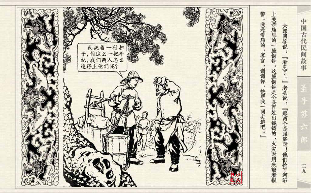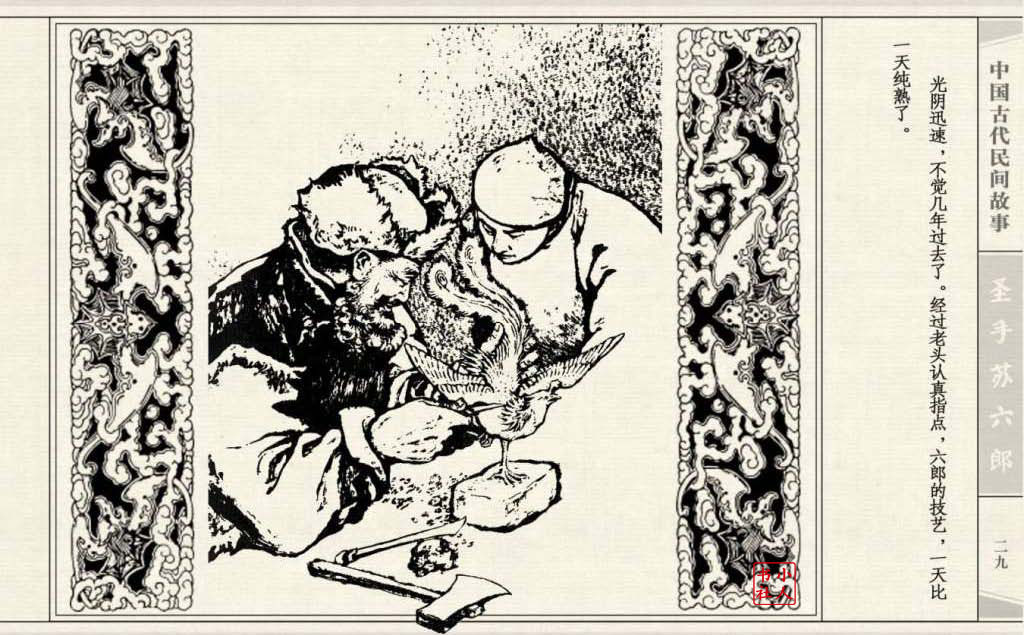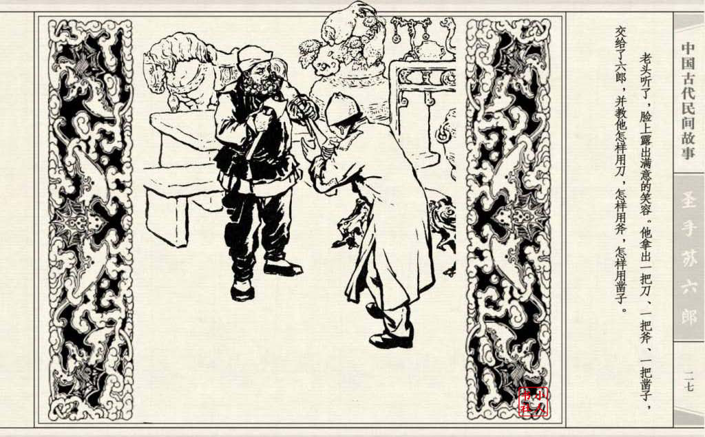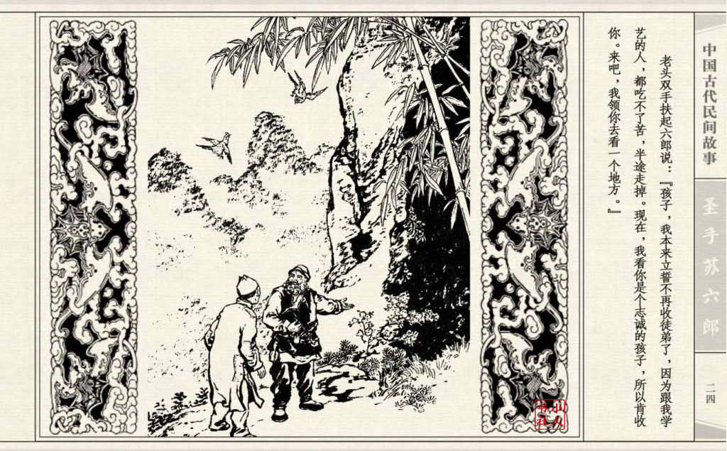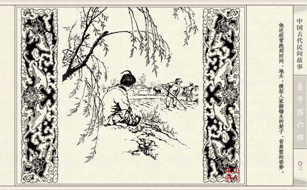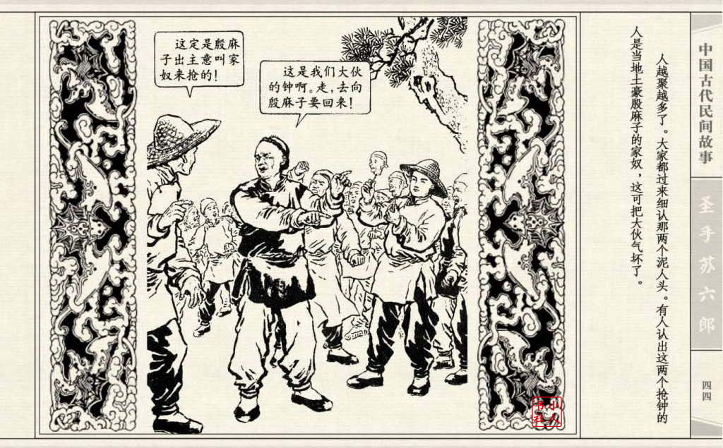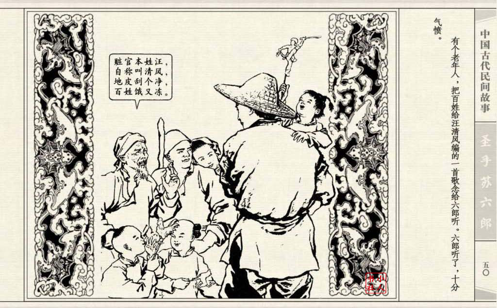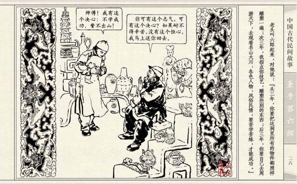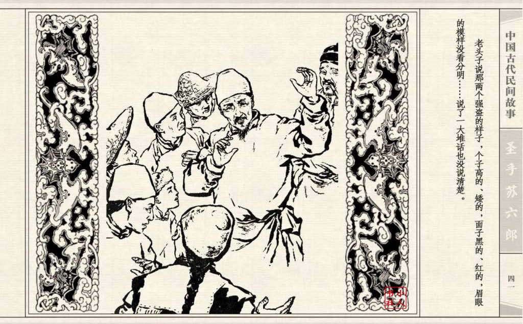 《圣手苏六郎》连环画是由管兴万改编,钱笑呆绘画。故事讲述苏六郎从小喜爱捏泥巴玩,而且到了痴迷的程度。一天,偶遇一位以捏面人为生的民间老艺人,执意要拜他为师。老艺人被他的诚意感动,收留了他。通过几年的艰苦磨练,苏六郎的技艺提高了,人也成熟了。他的技艺不仅是谋生之道,更是帮助穷人,讽刺,打击贪官污吏的武器。百姓们、同行的工匠们,有了困难,都愿找他帮忙。他的许多事迹在民间广泛流传。