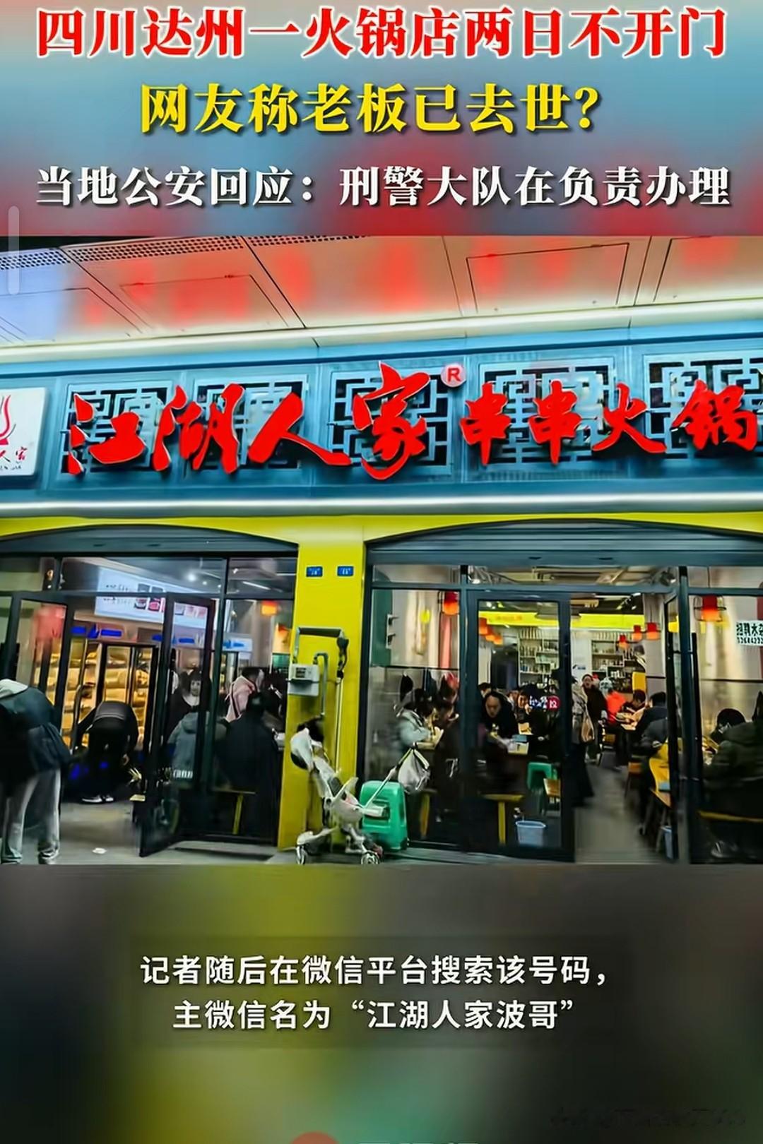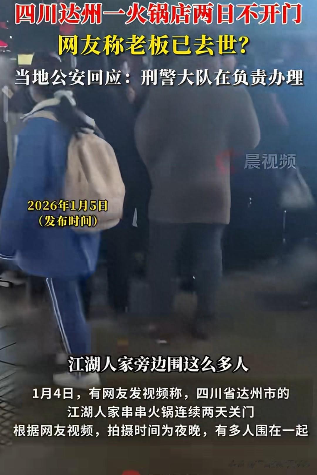 1月4日晚上,有网友发视频称,四川达州市的江湖人家串串火锅店连续2天都关门歇业,在店门口有许多人在围观而不敢进入店内,疑似这家火锅店发生了重大的事情!
